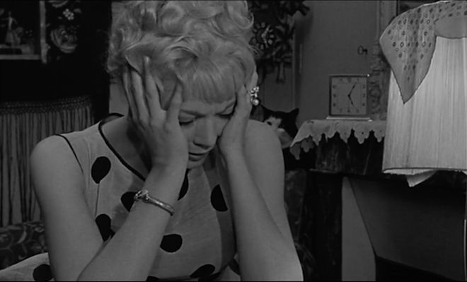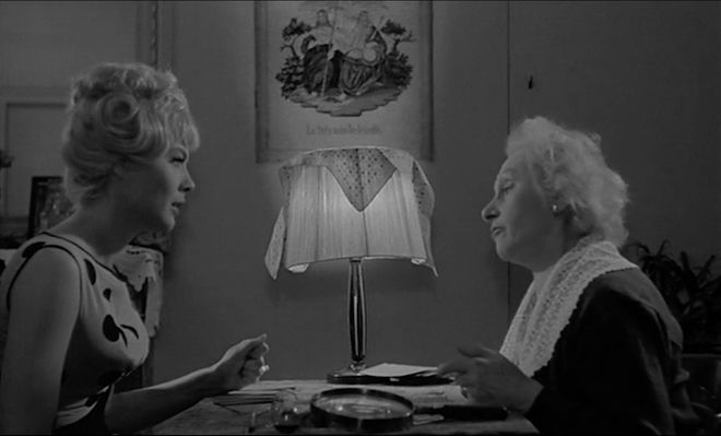 Further cards reveal more truths: the toxic introduction of a doctor, a talkative young man, a journey, and an illness, which Cléo confirms as the film shows for the first time her worried face in closeup, followed by a reverse shot of the older woman, all shockingly in black and white.