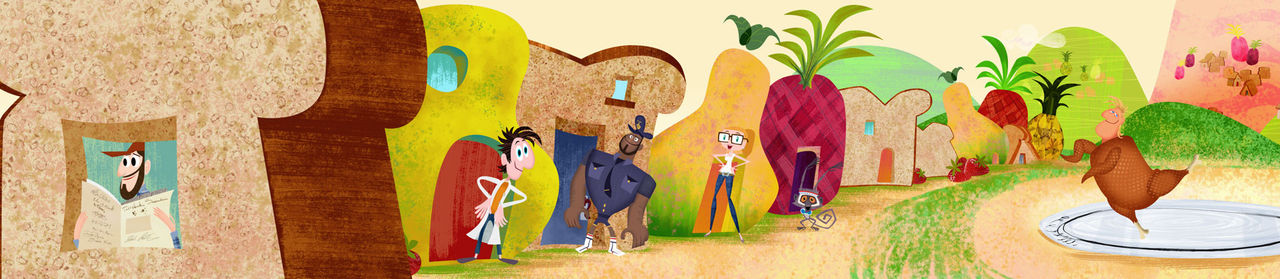 The background designs were primarily handled by the team of artists at Sony, led by Justin Thompson. They did all the backgrounds up until the molecules. We designed backgrounds and titles from there to the end. The Sony team also designed all the main characters for animation, led by Paul Rudish. We designed all incidental characters and FX. Once we received artwork from the Sony artists, everything was prepped and rigged for animation by our team at Duck.