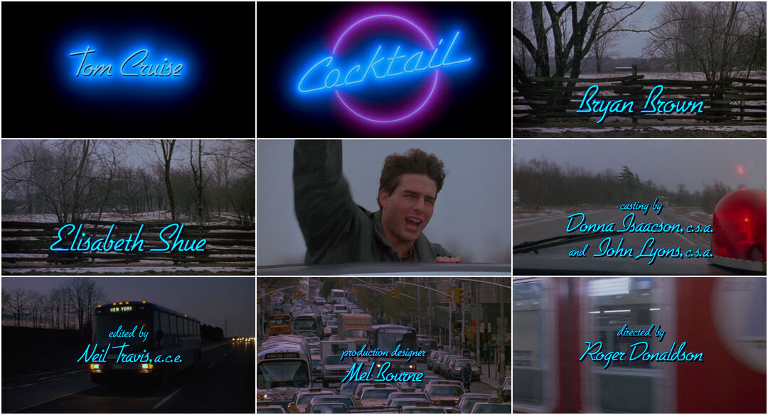 Still from Cocktail (1988) showing the indoor neon sign and logo for the bar Cocktails & Dreams