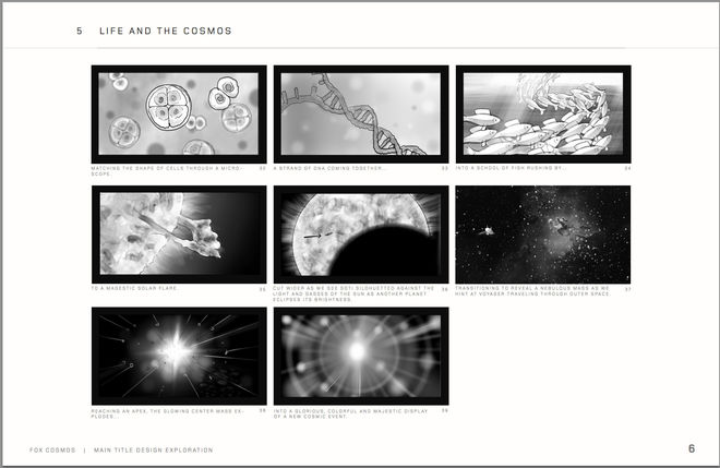 We discussed some general concepts that would be covered in the show, but were given almost zero directives as to what concepts we should explore. We were really on our own to figure out how to weave these concepts together into something that would reveal the logo, and pay homage to the Cosmos legacy.