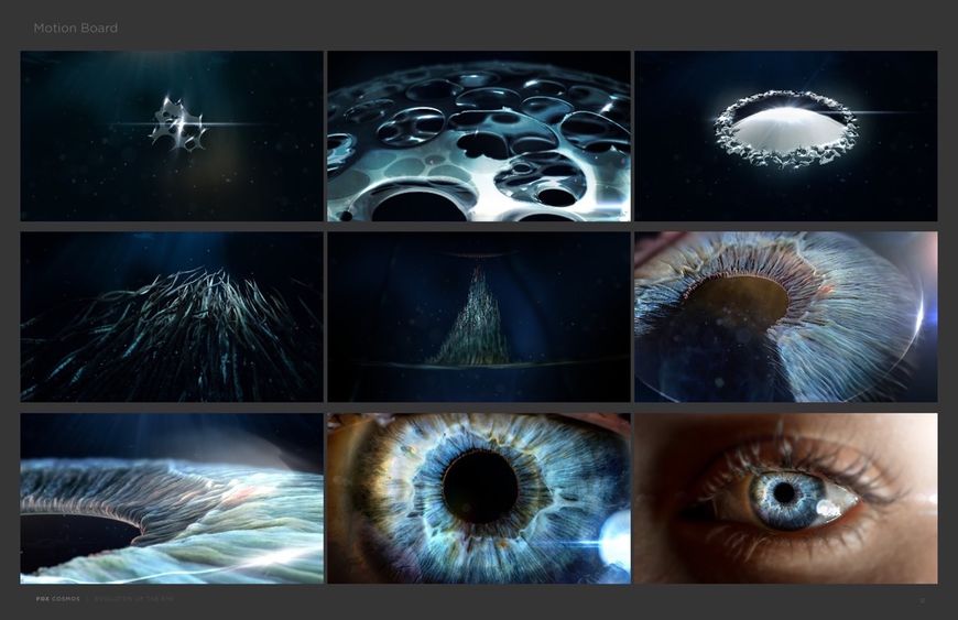 Initially, they approached us with an idea of a split-screen type of thing, to show what the eye would see as it evolved, but we decided to go with more of a graphic, abstract approach. The video was going to show an eye actually being formed. We had worked on some storyboards for some of the show content, based on a script about the importance of photosensitivity and how it was responsible for much of our evolution.