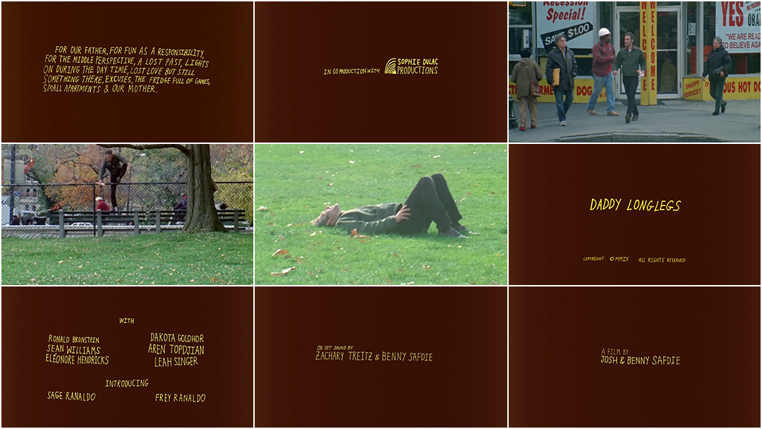 Dedication card Main title card Daddy Longlegs (2010) end credits Credits Title Design: Josh Safdie Support Art of the TItle Related Heaven Knows What summary Good Time summary Dr. Strangelove or: How I Learned to Stop Worrying and Love the Bomb interview The Addams Family title only Sickos summary Meet Wally Sparks summary