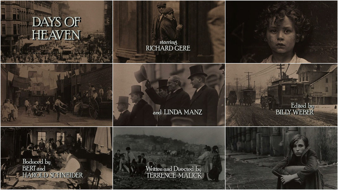 Firing a mix of critical thought and mesmerizing immersion, Dan Perri's title design for Terrence Malick's Days of Heaven combines street-level photojournalism with credit-to-character inferences intended to draw the curious eye. As the ears aswoon with "Carnival of the Animals - The Aquarium" by Camille Saint-Saens, you are nowhere if not here, with these people, in the Gilded Age of American history.