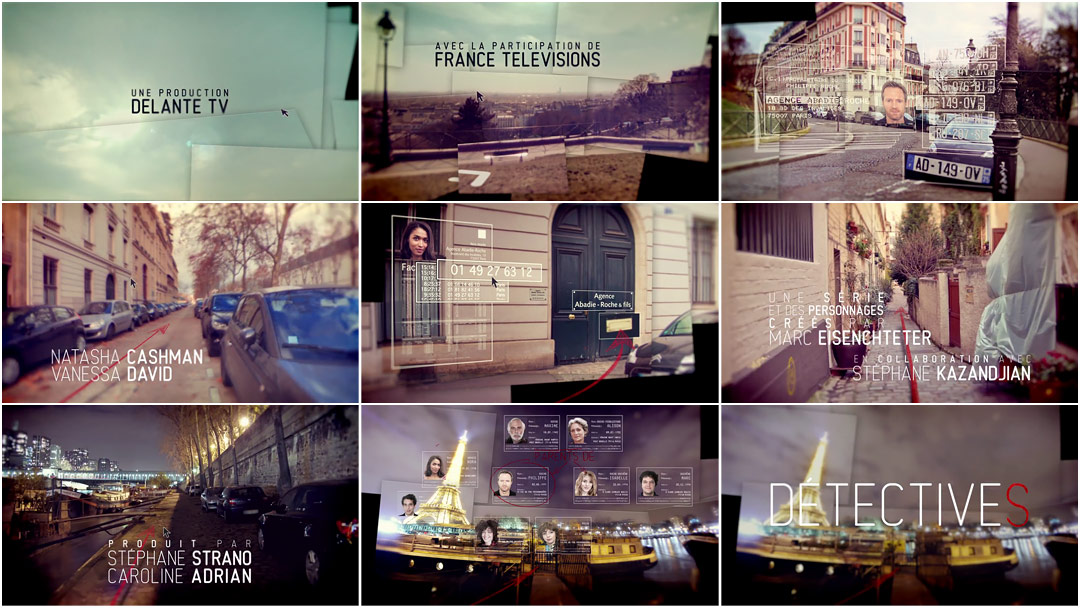 Détectives is a television show that aired on the channel France 2 in spring 2013. Delante TV got in contact with us early in the project – during the writing of season one – for the design of the opening credits. We had collaborated with Delante before on the feature film Moi, Michel G (2011).