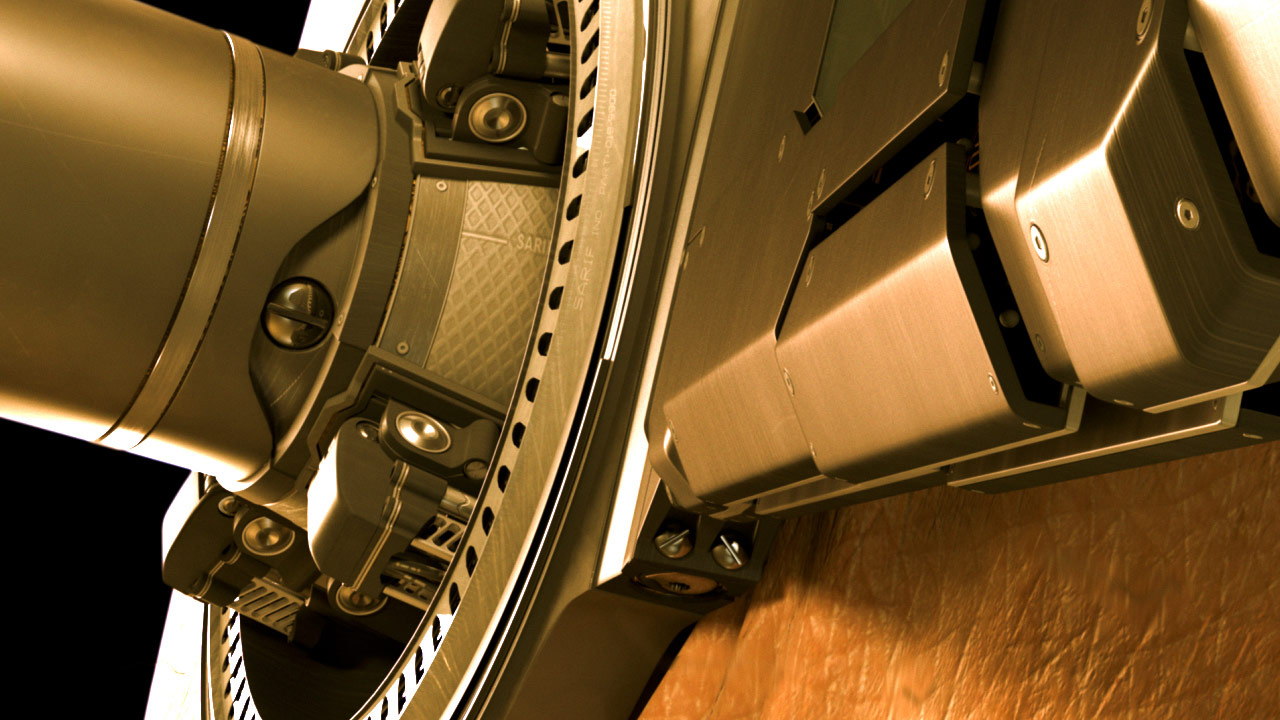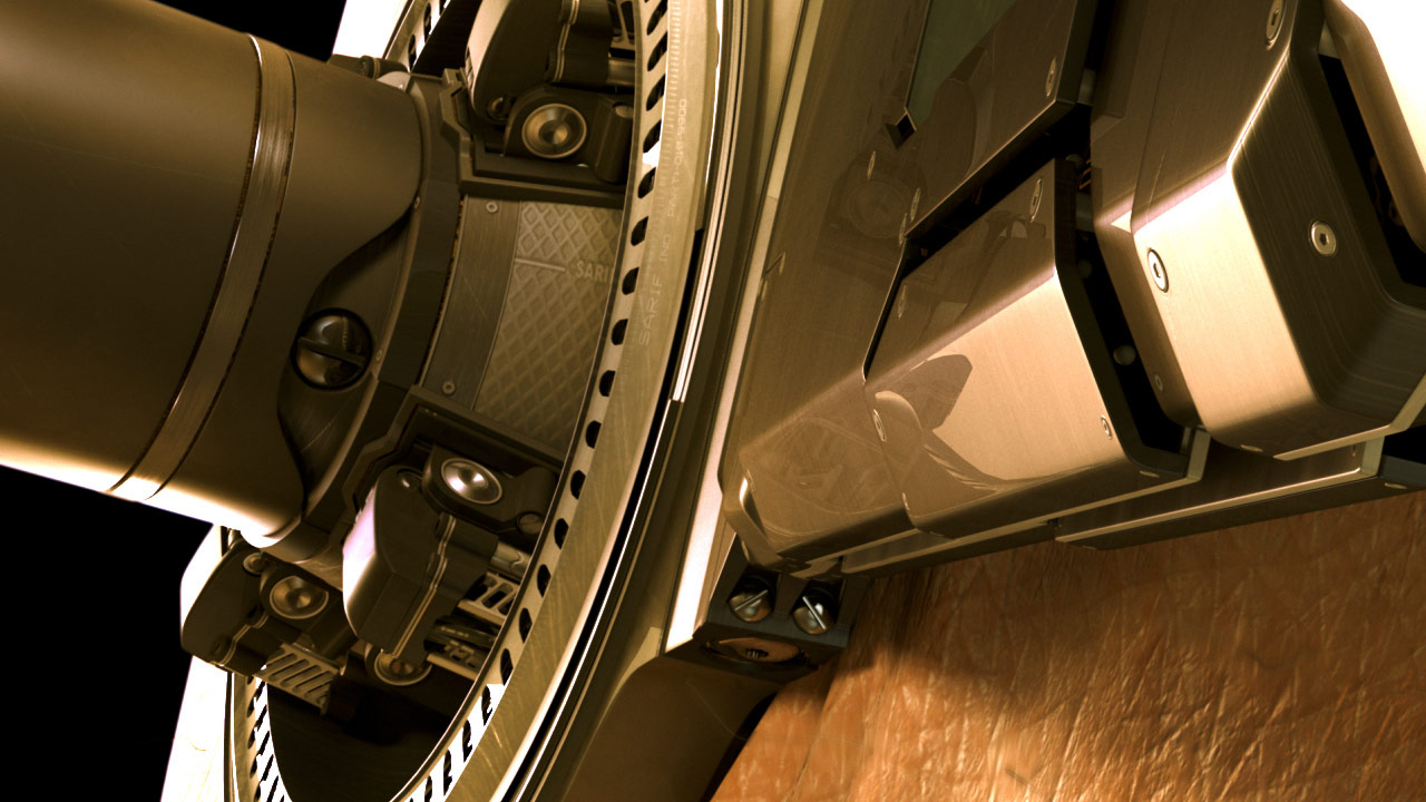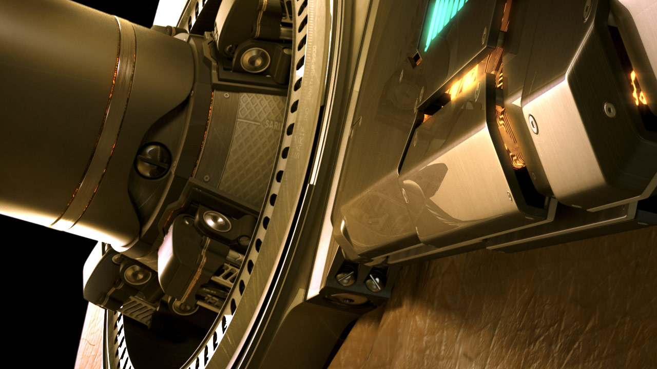 Consequently, the original computer-generated imagery seen in the title sequence had to be created in-house by a small team led by Mike Smith-Kennard. We focused all our CG production energy on key visuals: the heart covered with Sarif-owned circuitry, the gears driving augmentations deep into Jensen's body, and the robotic arm splayed out on the operating table, among others.