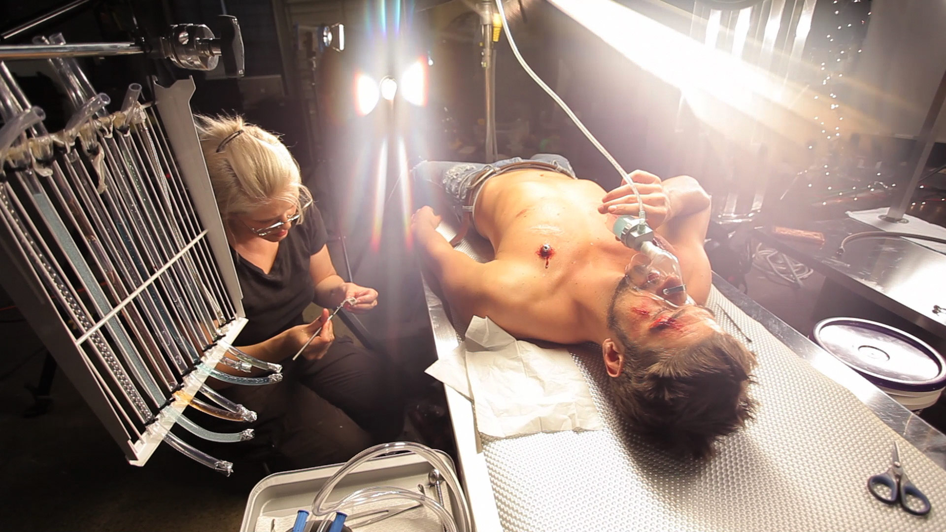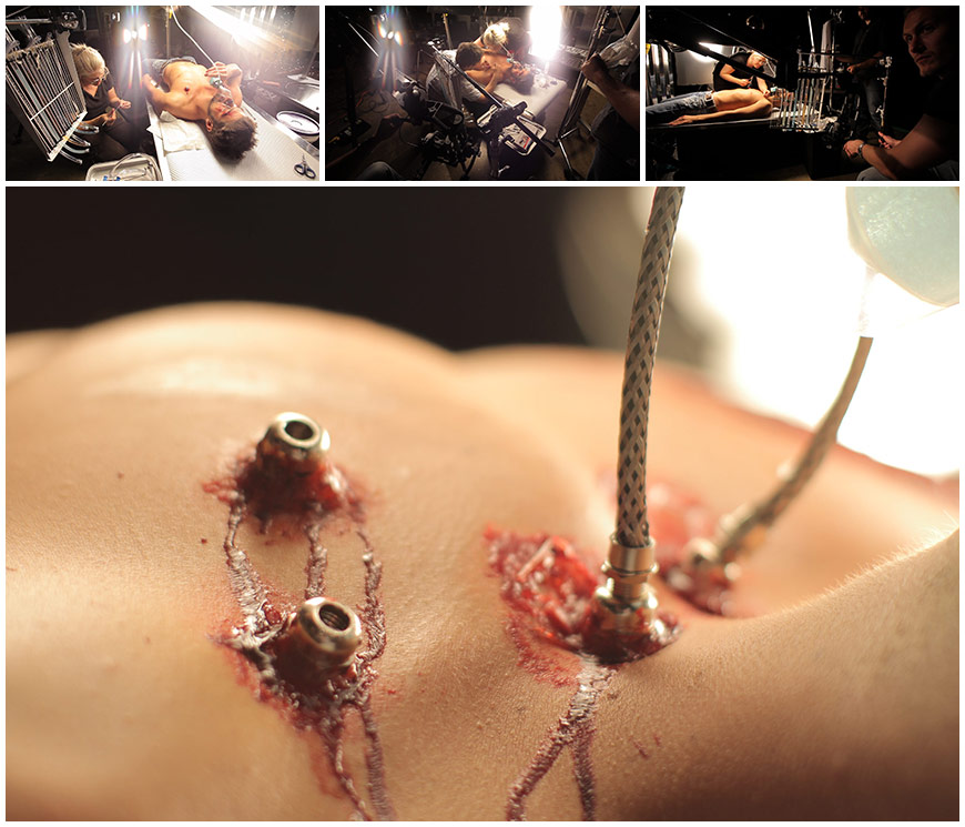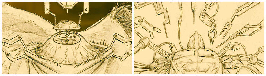 PF: Once we decided to take the mixed media approach for the opening credits, I went through the animatic and clearly defined the shots that would need live-action elements. The entire shoot was done over two easy days, each around eight hours, which is very relaxed for a live-action shoot. On the first morning, we shot all the love scenes with our Megan and Adam lookalikes. In the afternoon, we put Adam on our futuristic operating table and got all of the surgery shots. On the second day, we shot all of the still elements, the pyro/effects plates, and we did the more serious operation shots – for example, we shot the circular saw cutting into the fake human body on the second day.