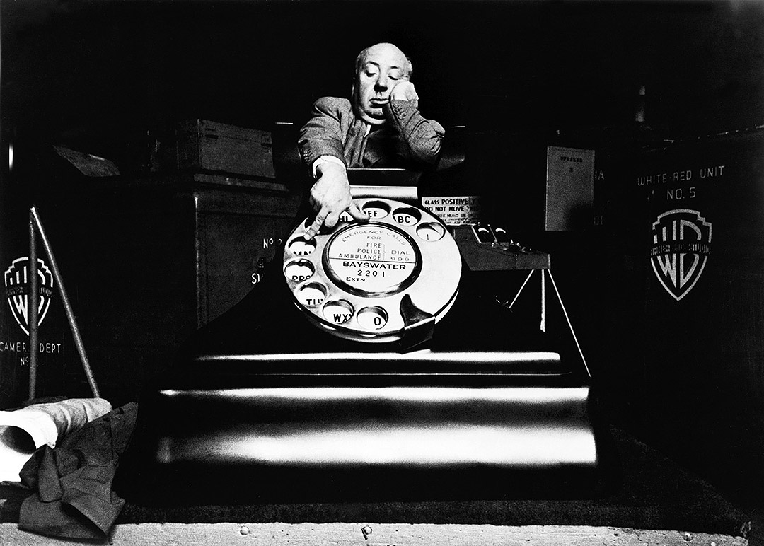 Director Alfred Hitchcock pictured with the giant telephone prop built for Dial M for Murder.