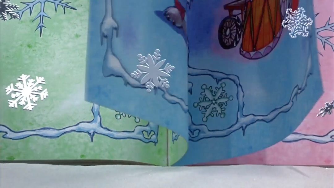 Charlie: And then we incorporated the animated characters! The puffin appears several times through the animated sequence, dragging sleds in, getting caught, having a box fall on him, getting blown away in the wind, and that was additional stuff that had to be coordinated with the very complex camera moves and animation.