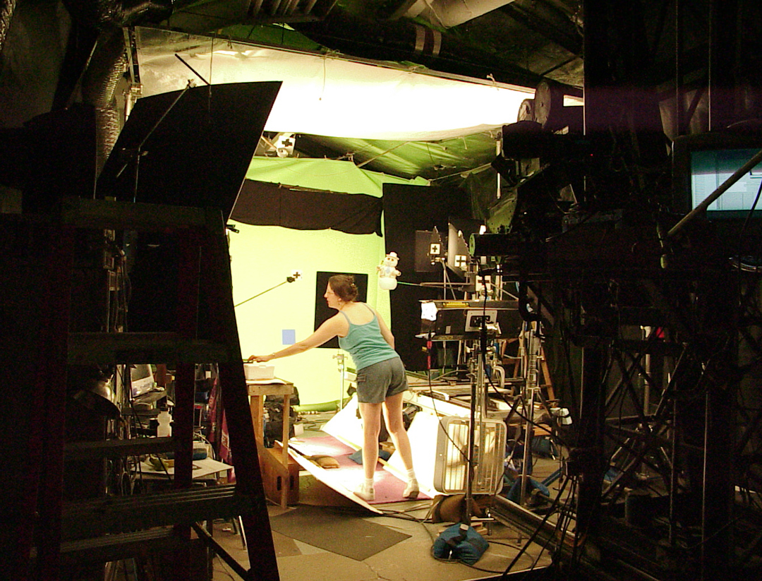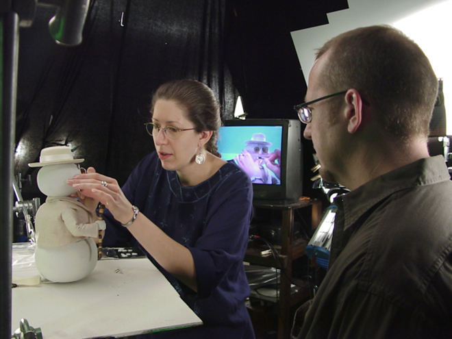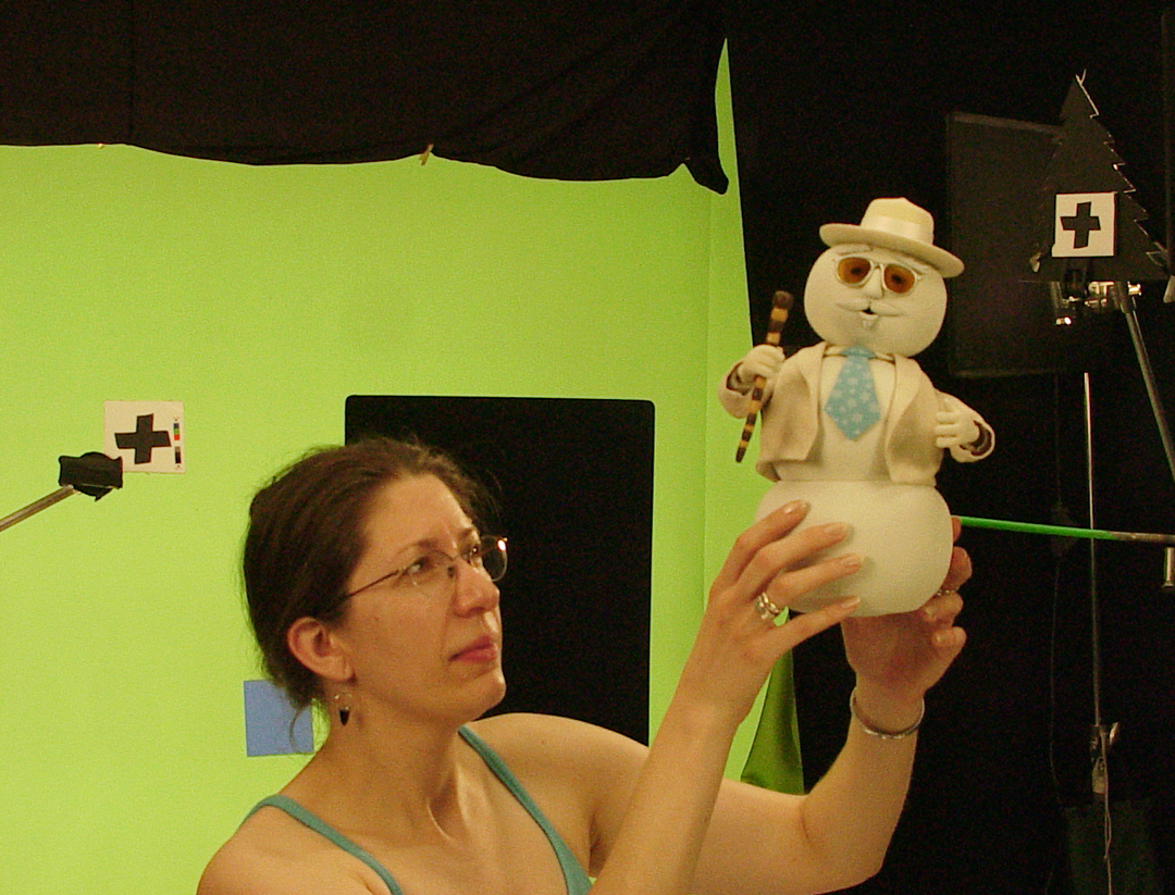Animator Teresa Drilling animating Leon the Snowman against green screen on the motion control stage.