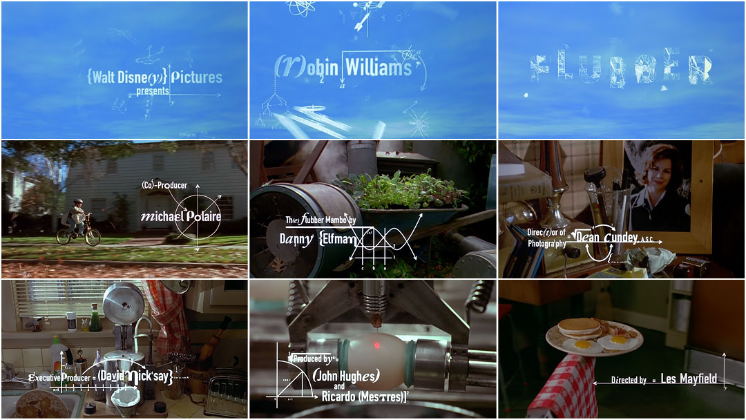 In the instance of Flubber, which which concerns an inventor who creates a rubbery substance that helps people to fly, the names of the film's cast and crew swirl around the screen in a playful way, forming credits that look like mathematical and chemical equations. Chains of chemical bonds, twisting helixes and graphic notations bounce around like the brainstorms of some irrepressible inventor, their manic motion perhaps unwittingly replicating that of the film’s notoriously hyper star, Robin Williams.