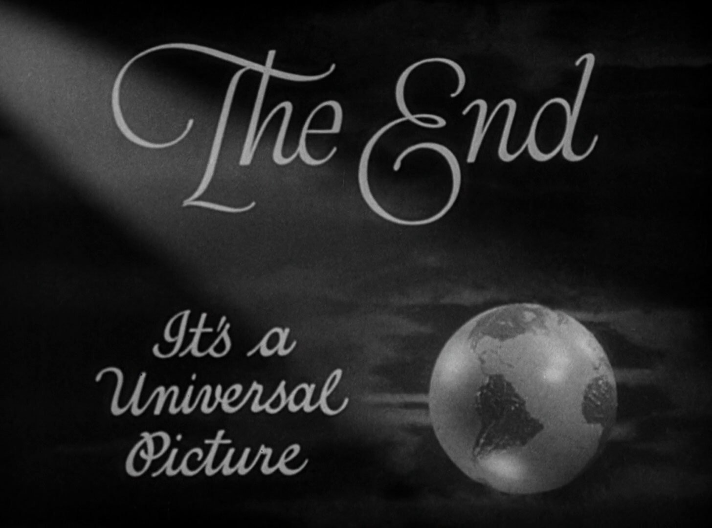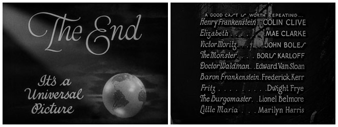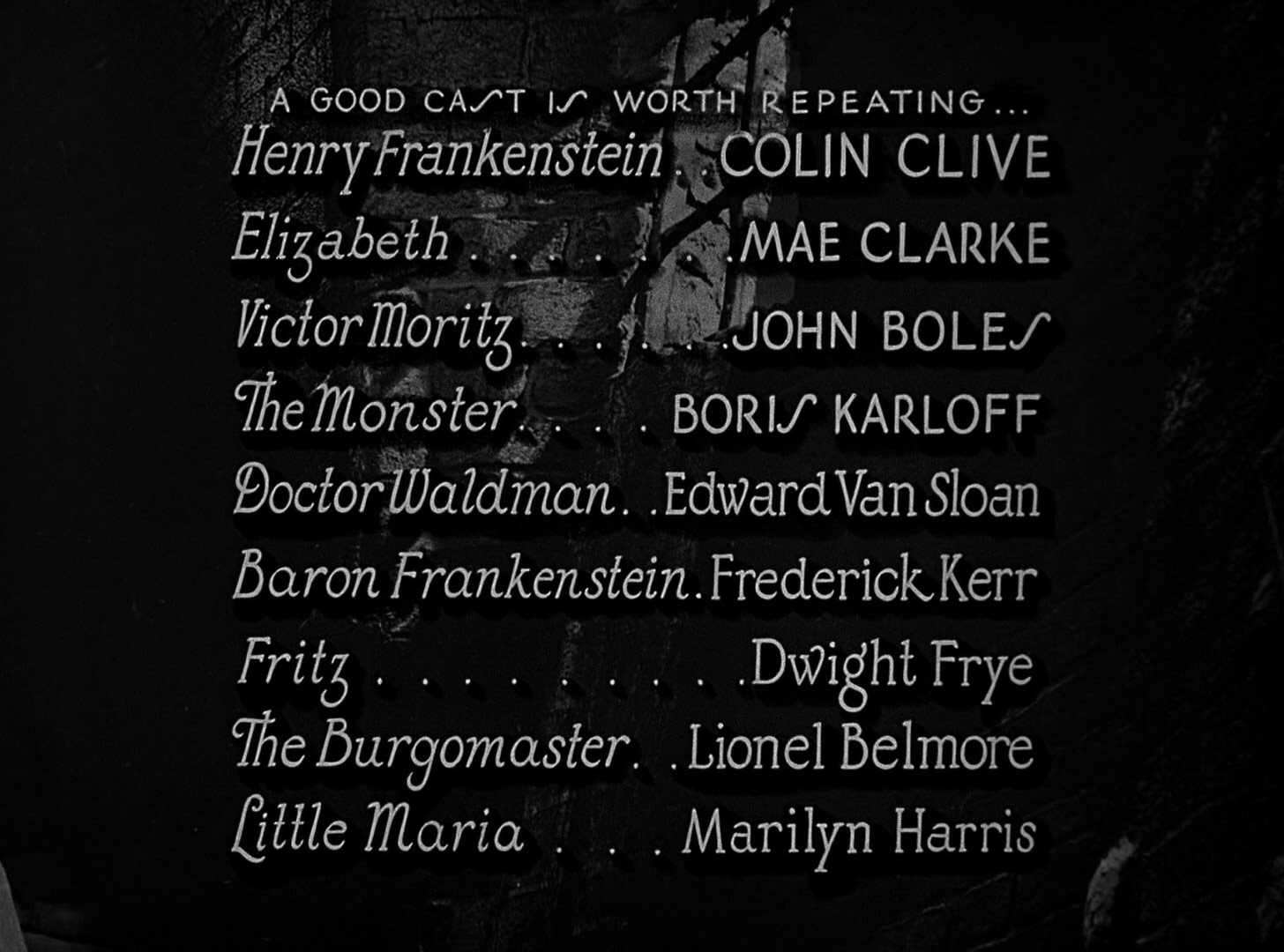 Frankenstein end title cards, with a playful “A good cast is worth repeating” heading.