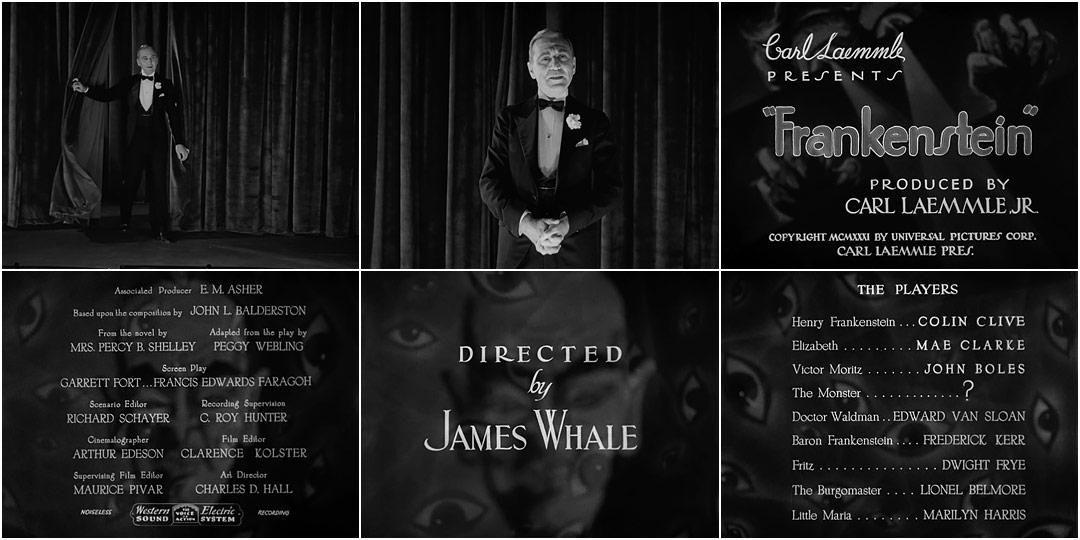 Using the carnival sideshow technique of enticing audiences by warning them of the dangers, James Whale's Frankenstein begins in a theatrical and rather endearing way. Only after the creators are absolved of any potential unpleasantness may we continue to the title sequence, complete with elaborate eye-filled background, and the film proper. The only music that appears in the film appears here, in the opening credits, and in the closing credits.