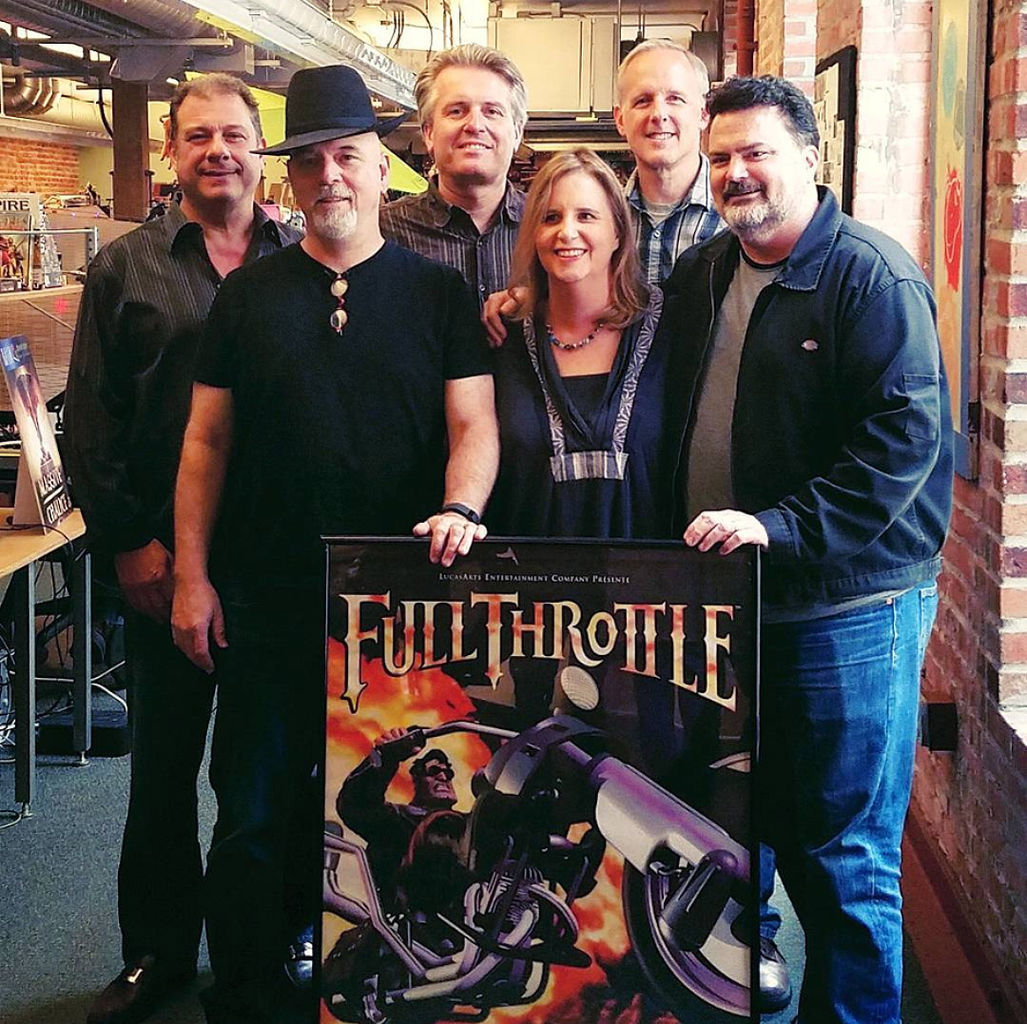 Members of the Full Throttle team in October 2016. From left: Lead Sound Designer Clint Bajakian, Composer Peter McConnell, Lead Programmer Stephen R. Shaw, Production Manager Casey Ackley, Lead Animator Larry Ahern, and Project Leader Tim Schafer.
