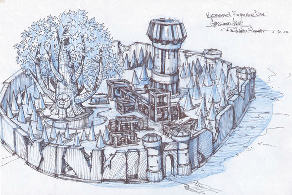 With the shape of the world determined, we started doing concept art, detailing what these places would look like given the fact that the world is round and they're made of wood and stone and they're of a certain size. We had several very talented concept artists working on this. At the same time we set up the world in previs and started blocking out the sequence. It seemed fruitless to do storyboards because they don't move and in my mind this whole sequence had to be really dynamic. The camera had to be moving the whole time, taking you on a journey. So we blocked the big moves, the moves from place to place, then focused on how we were revealing the different locations and how they were emerging from the surface of the map.