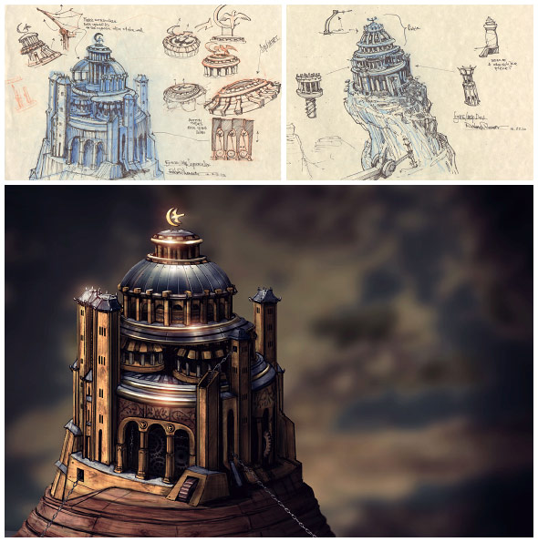 At this point, we made a list of the locations we needed to build. Then we figured out how many different versions of the sequence we would need to create, the idea being that the opening title would show you all the places you would visit in each episode. And we boiled it down to four different sequences, each a subtle variation.