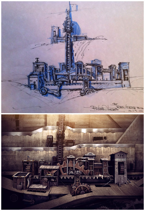 As soon as we had final concept art, we pushed it to the model makers working in Maya. These guys were amazing, taking sketches and turning them into working objects, adding tons of their own inventive details in the process. These models in turn, got incorporated back into the previs. It's really too bad the sequence is only 90 seconds long, because there's so much detail we were not able to show. If you're going to create a world, in order for it to feel legit, you have to have this fractal sense of detail. There are dust motes in the air when you're passing through, and all the cogs have a logic to them. There are cogs actually under the surface of the map that you can barely see in the gaps between the model and the surfaces of the world itself. There's such an amazing amount of detail in the models.
