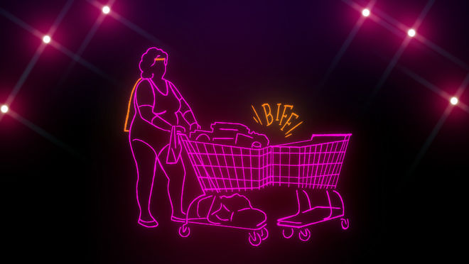Richard: There was a short period where we were looking at a version where the girls were doing more mundane tasks instead of wrestling. Tasks like household chores and errands, but in the neon style. It’s a funny idea, but actually doesn’t make for a very dynamic title sequence.