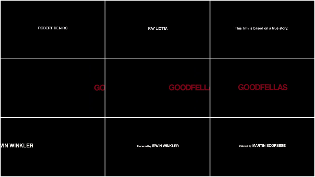 The title sequence was resolved fairly quickly, partly because Scorsese already had an approach in mind, partly because there were no "backgrounds" to be considered, only lettering, and partly because Saul and Elaine came up with what was used after only one or two attempts. Scorsese wanted the sequence to reflect the frenetic pace of the film based on Wiseguys, Pileggi's composite biography about Italian–American mobsters, but since the credits would bookend the extremely powerful opening scene involving cold-blooded murder, Saul and Elaine were anxious not to overwhelm the action with elaborate visuals. The lean, hard-edged credits rush across the screen, blurring like a car passing at high speed just like that in which the "Goodfellas" are traveling — to a background of doppler-effect traffic sounds. Before the murder the typography is white on black; afterwards it changes to red.