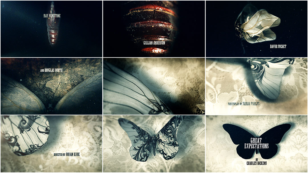 The Emmy-winning title sequence for BBC’s sumptuous adaptation of the Charles Dickens classic Great Expectations takes entomological allegory to new heights. A pulsating pupa cracks wide to birth an ever so delicate creature amidst utter decay — the young and impressionable Pip. Wings unfurl as motes of dust dance in the air, soft chitin and moldy old lace intermingling in the muted sunlight. Fluttering blindly, the newborn butterfly begins to transform, its virginal wings inked with an ornate and corrupting design. Soon the insect is completely overwhelmed by the filigree, spasming under the weight of possibility, withering away until it becomes a mere spectre of its former self.