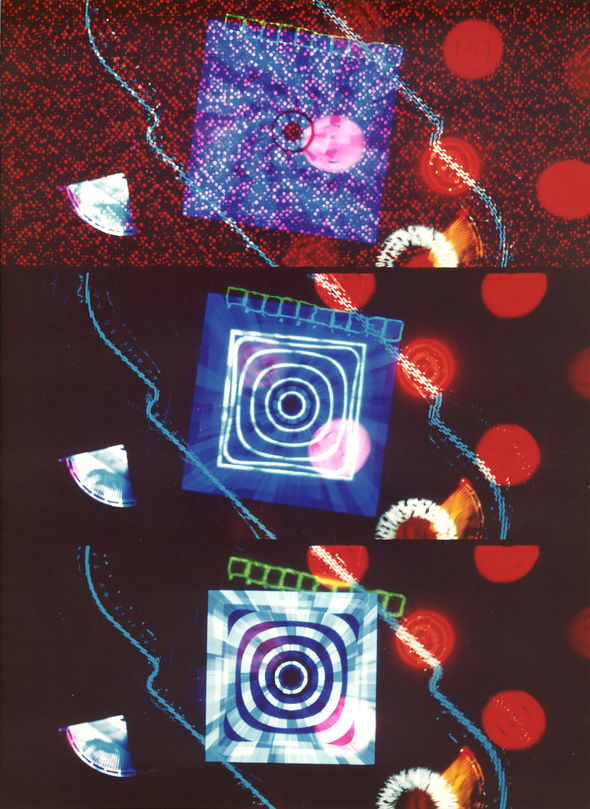 Well, once I had my Cromemco fired up, I got to work on the animation for the sequence. I created two general block pixel “characters” for the sequence. The normal dog cells were rounded shapes that were blue, and the alien cells were red, three-pointed, spiky shapes. The action for the scene was very simple. Much as most cancers work, the alien cell attacks a normal dog cell, infecting it and causing it to mutate into a new alien cell. To shoot the sequence, I set up an animation camera in a light-tight box, shooting directly at the screen of a black and white high-resolution monitor. Since the computer ran too slowly to render the frames in real time, I set up the animation program to instruct the computer to render a frame, and then send a signal out a serial port – think old-time USB – that would trigger the animation camera to shoot a frame. I could then start the program and leave the computer to do its work, finishing hours later. The color was achieved by placing filters in front of the animation camera. Each scene was exposed three times: once for the blue cells, once for the red, alien cells, and a third time, for white text overlays.