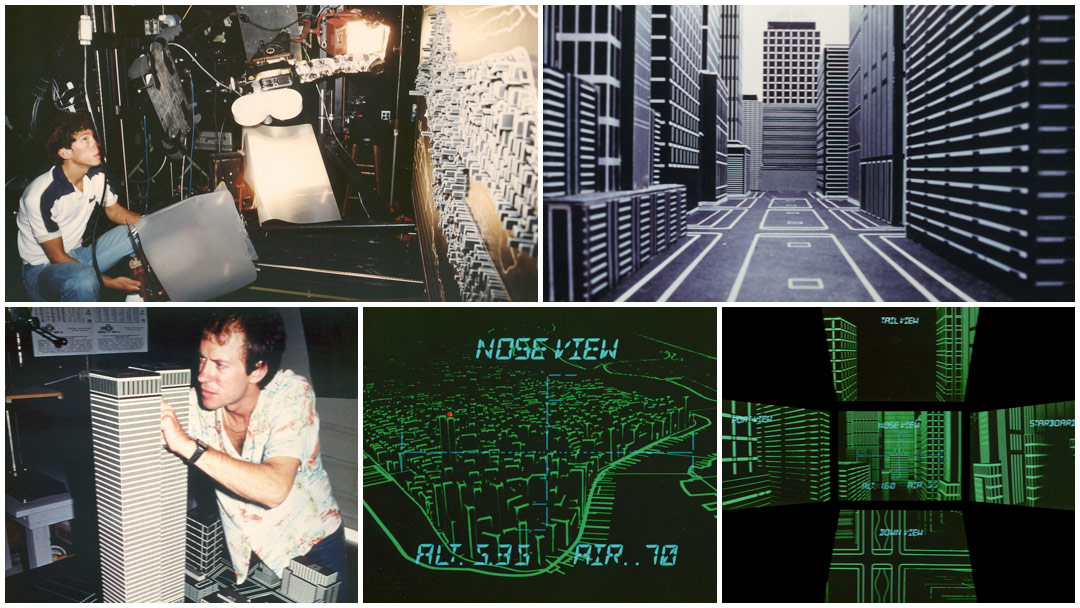The other set of models involved larger scale buildings, about 24 to 36 inches high, so that we could fly a motion-control camera with a snorkel lens between rows of these graphic skyscrapers. These larger models were made of wood, with high-contrast lithographic line art glued onto them. The models were shot at the original Dreamquest facility, which at that time was in the garage of a ’50s ranch-style house just south of Santa Monica.