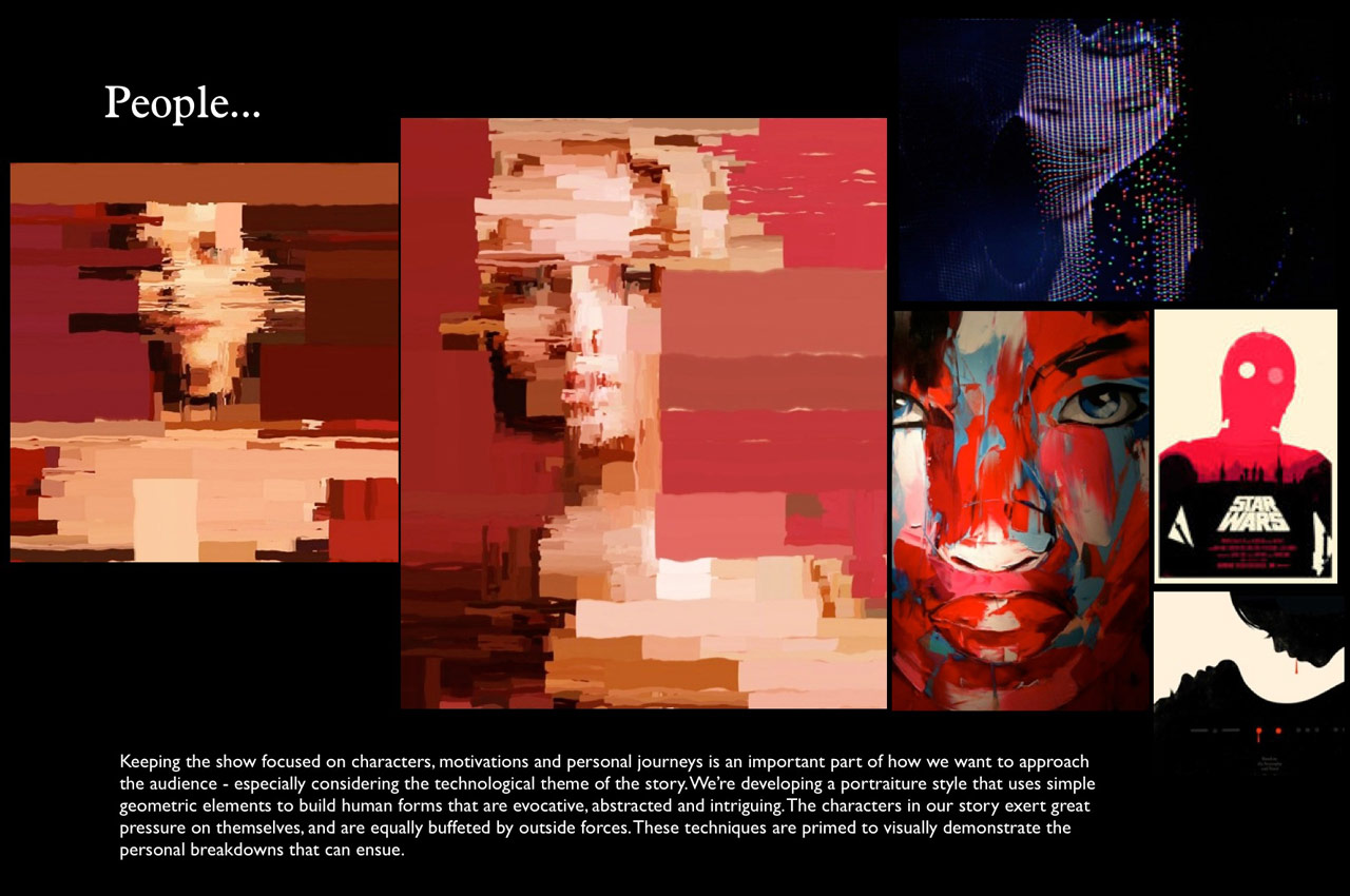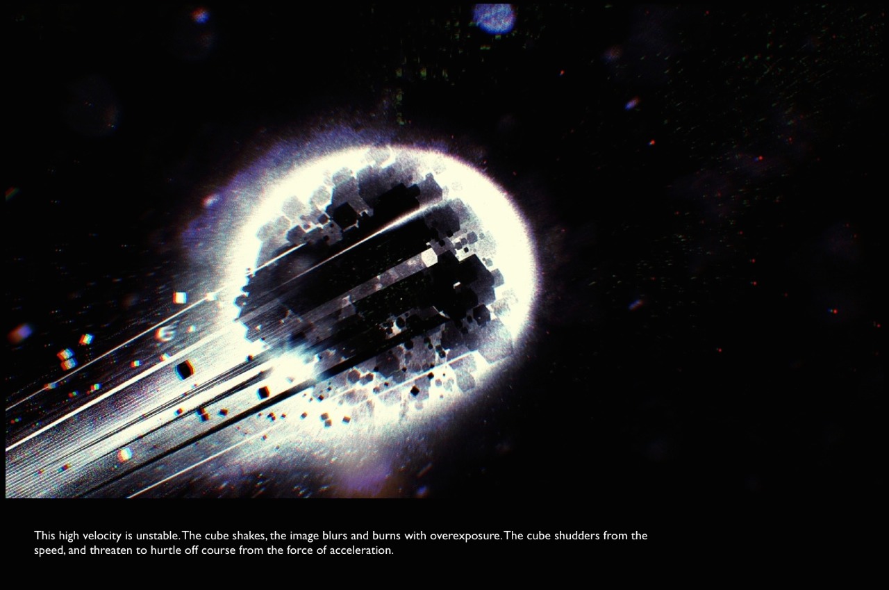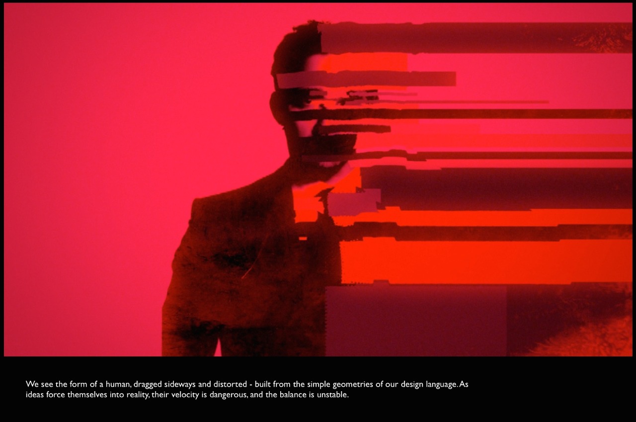 Raoul: I really wanted to steer clear of the more overused tricks that are associated with the style. The general idea was to show these characters undergoing great pressure, as if re-entering the atmosphere from orbit but in a digital world. Detail should shake and rip across the screen, smearing as it goes. It needed to maintain a tactile quality but introduce the underlying order that digital artefacts often carry. Debris and facial details could be torn across the screen but they'd only ever move along straight lines – never an angle.