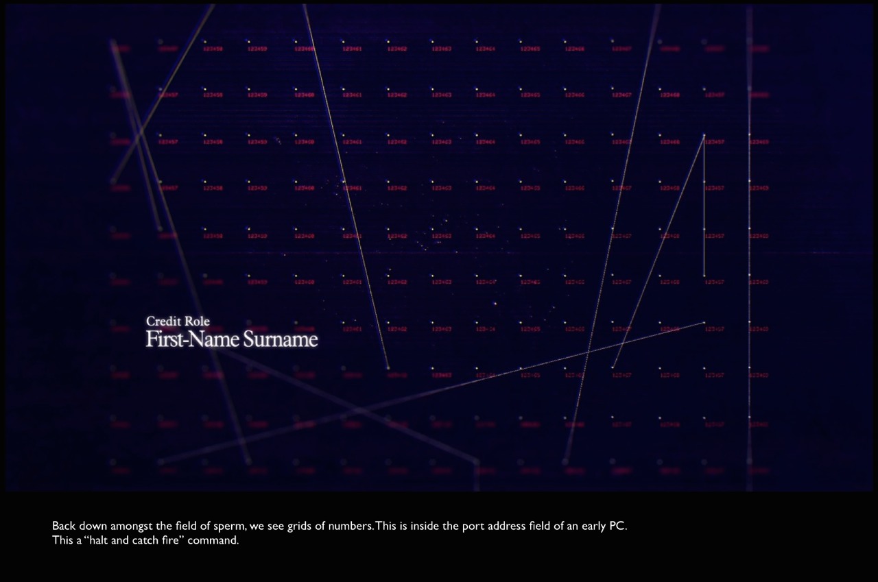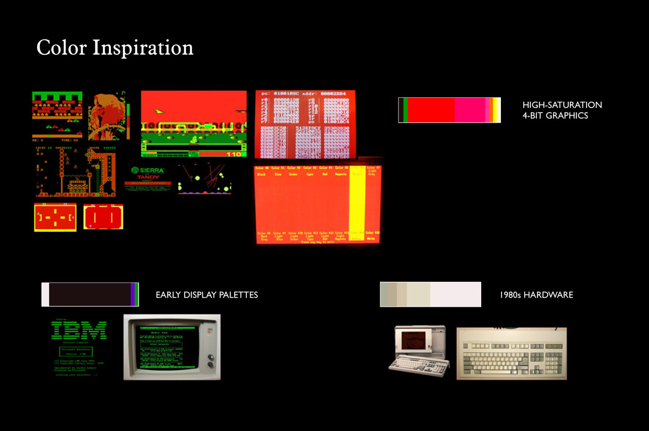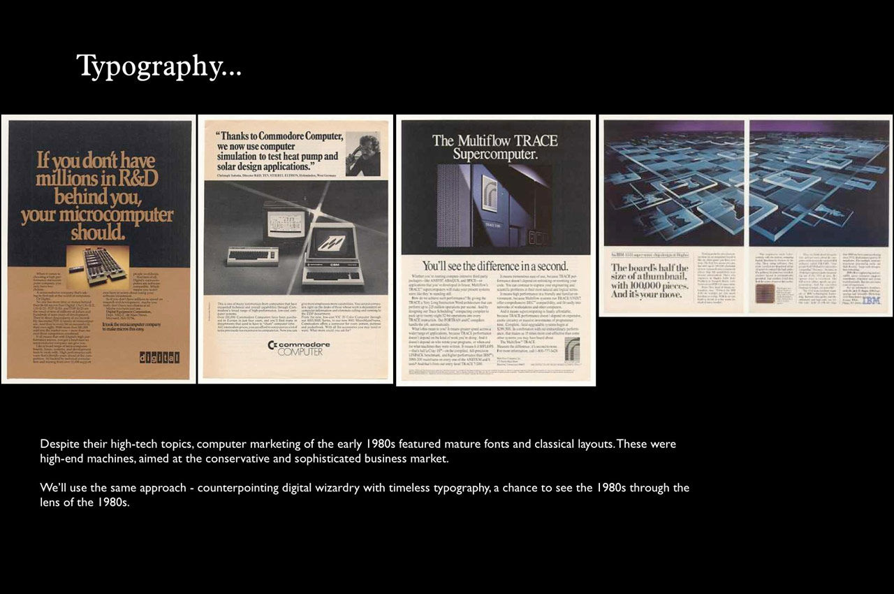 We also took notes from the more conservative home personal computing advertising of the era that predated the "hi-tech" style that was soon to follow. This included serif fonts and classic layout design. Patrick had some brilliant ideas on the colour palette: an iridescent red that never peaked beyond hot magenta. A lot of time went into fine tuning the colour grading. Maintaining the red/magenta and the images' readability was a very fine balancing act. I just hope people's older televisions sets don't give up when they receive the show’s signal.
