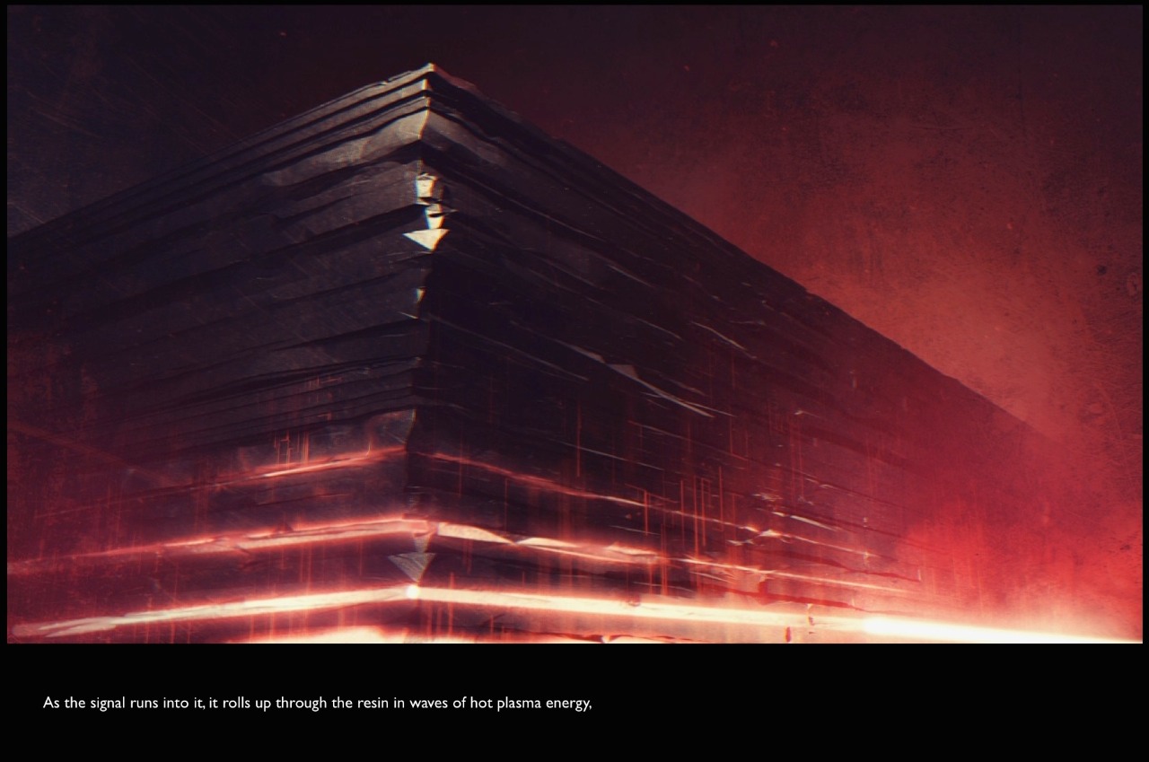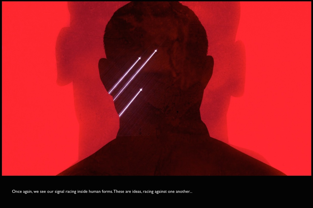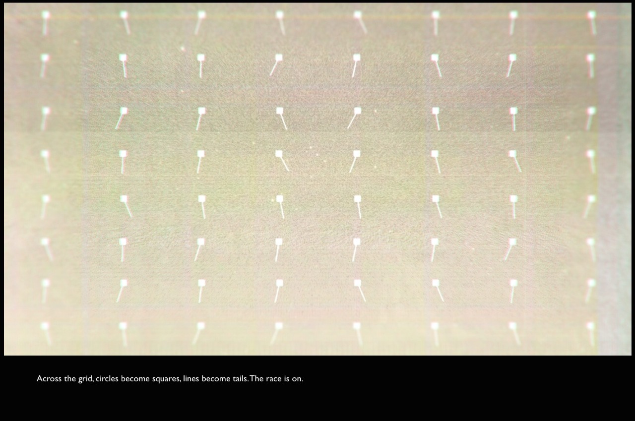 Raoul: With that in mind, we boarded out a sequence. In essence these boards depicted the birth of a 'signal' and its journey to fire up a light. This was at the machine code level, an idea represented by simple graphic forms slowly evolving as it gathers pace.