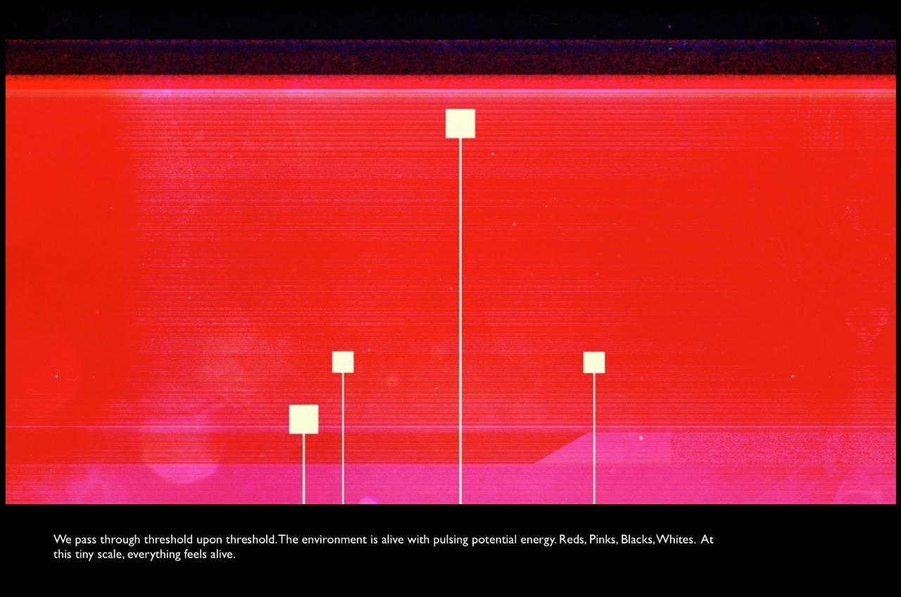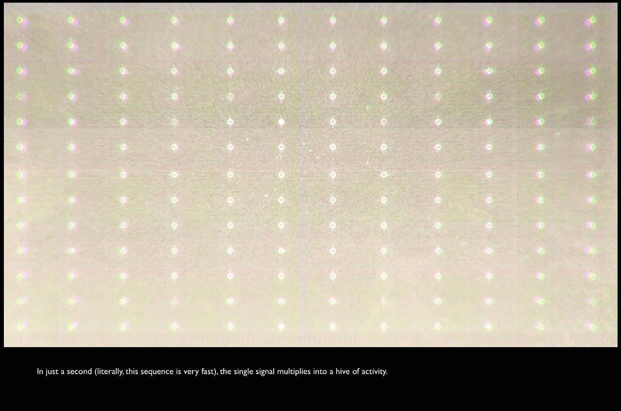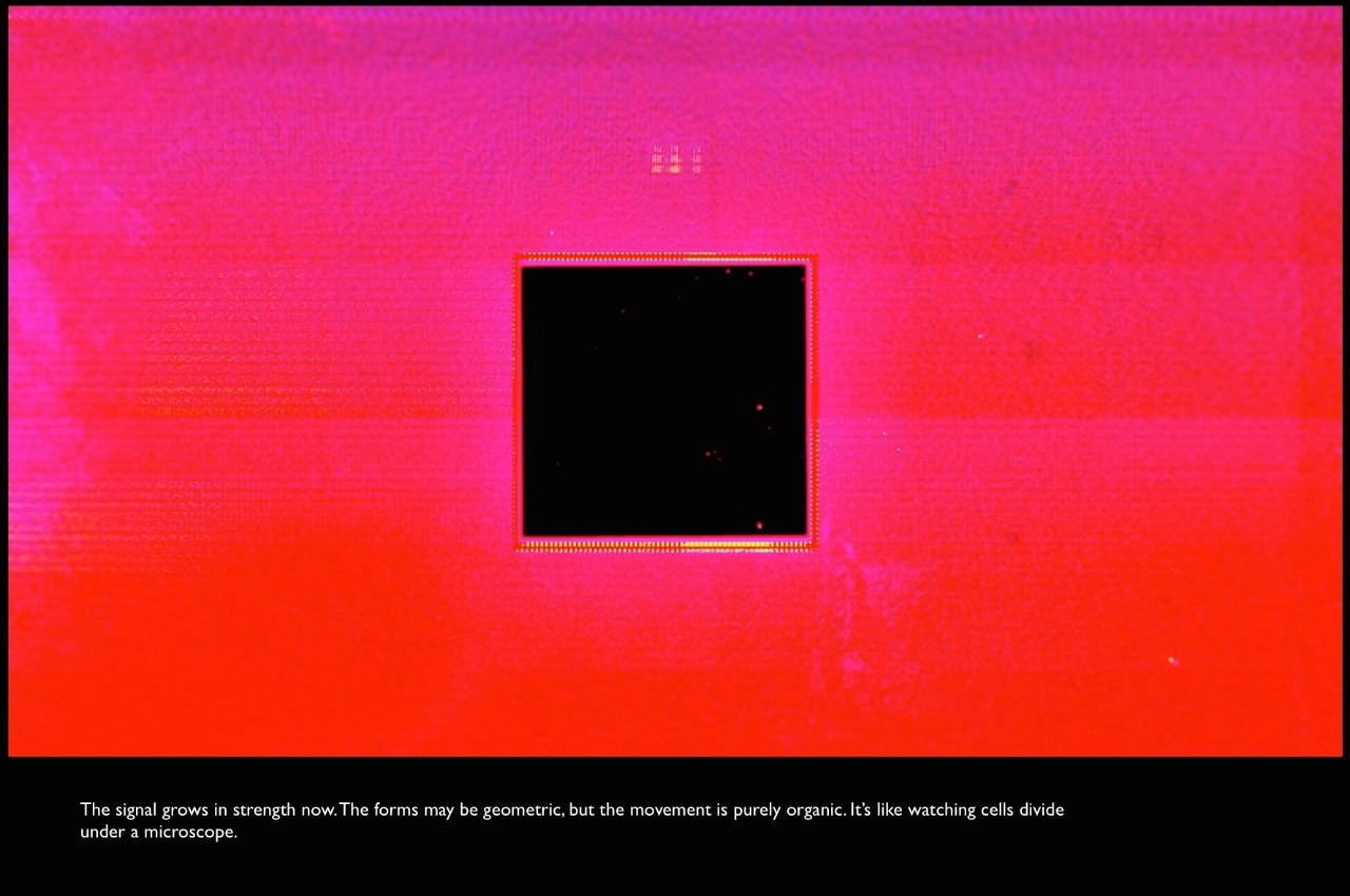 Raoul: Eddy did some amazing boards that fully fleshed out a sequence from machine code to digital dividing cells. We also had a far more elaborate sequence showing the signal lighting up the LED. At one stage we moved entirely over to a light bulb-like structure with a more conventional filament lighting up as in old valve electronics. This swung back around to the LED, though, in further iterations.
