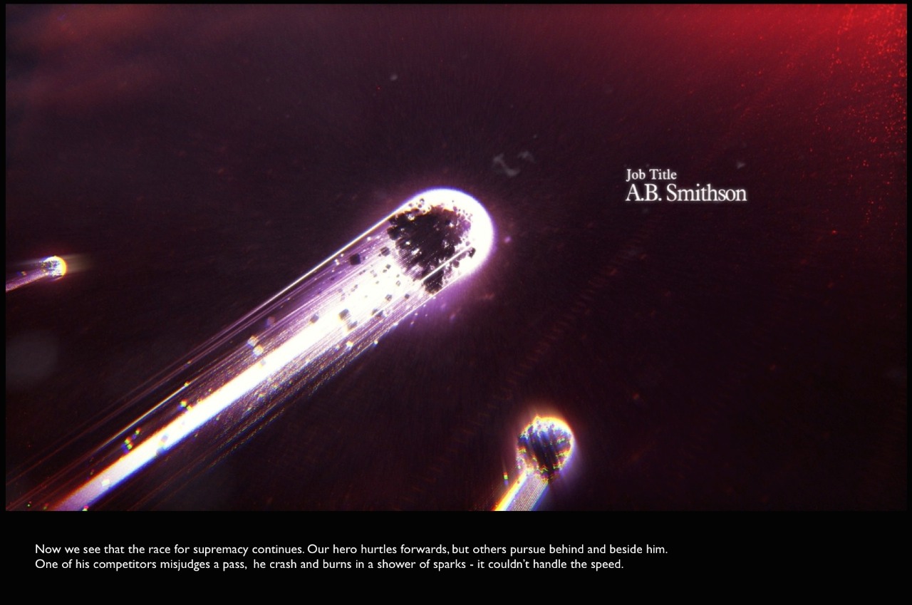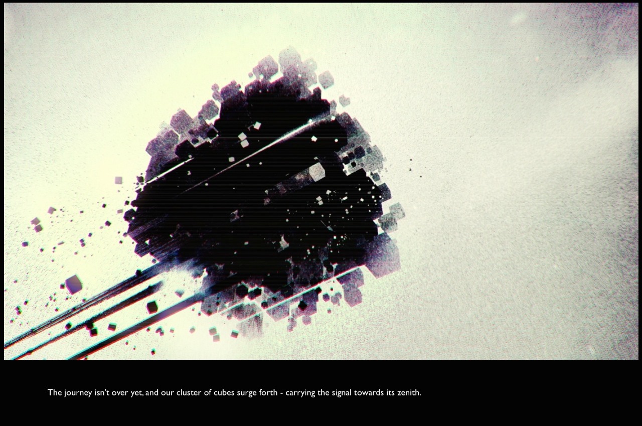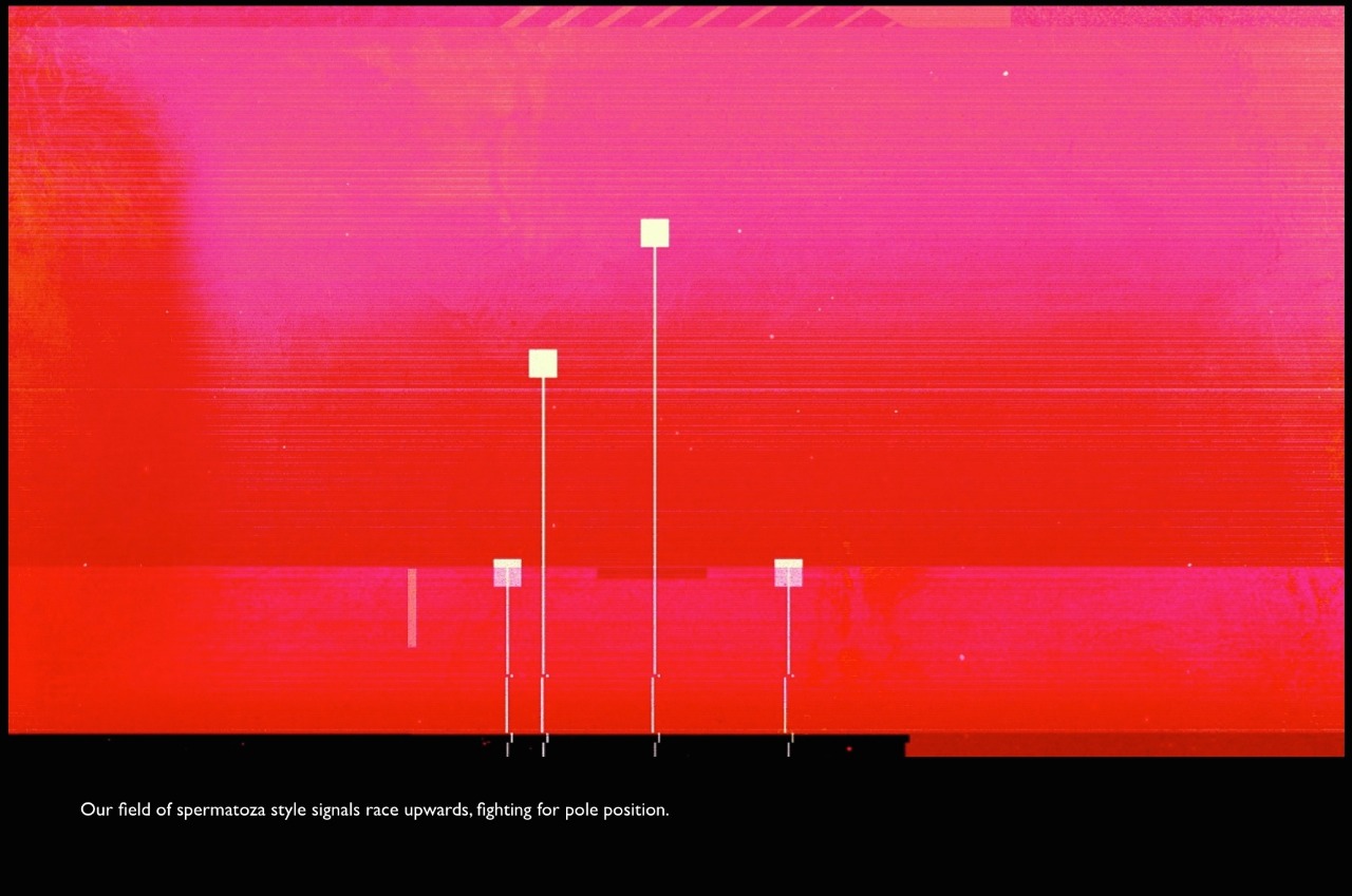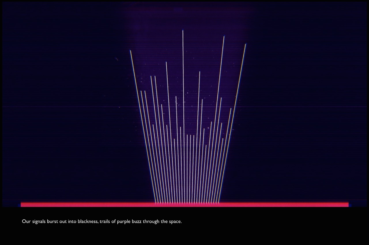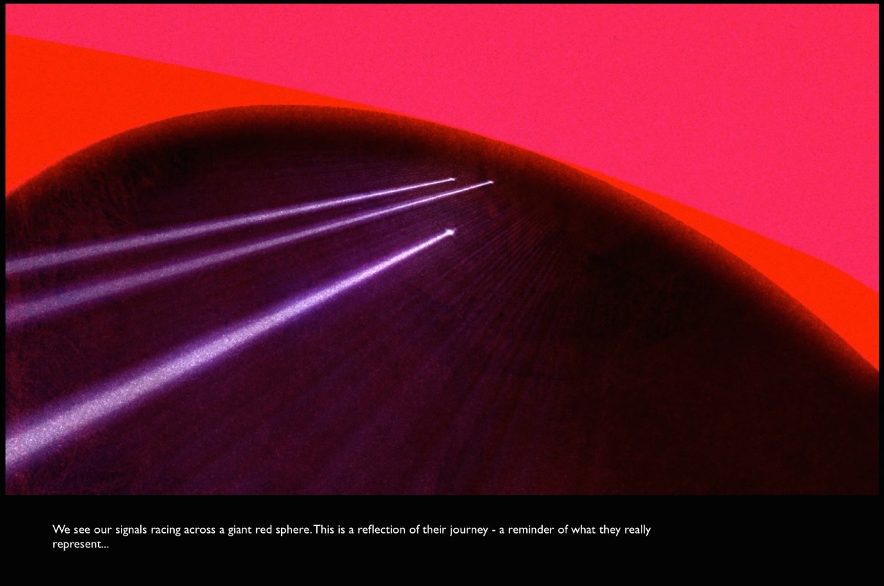 At this point – in the original pitch – we had other "competitor" signals. They were either burning up and disintegrating as they travelled too fast, or not keeping up and being left behind. We had to pare back a lot of the narrative for a simpler story, but there are still elements of this in the final piece. With only 30 seconds, it’s very important to not over-complicate the message. It was important to get our ideas rock solid instead of diving straight into animation.