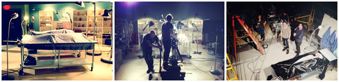 For example, the first draft of the concept had no exterior Northern Ontario shots at all. The “northern” imagery was going to reveal graphically in the medical textbooks of the students. This eventually changed to include exteriors so we ended up with the three elements: exteriors of the iconic north, the graphic component, and the medical portion. Finding the medical lab-type space that both suited our needs logistically and aesthetically was a concern since we wanted a specific look. The main unit was building a set in Sudbury but the completion date was about a week before we were scheduled to shoot, so we didn’t know whether it would suit us until the eleventh hour. In the meantime, we found a great location with some nice retro elements. Unfortunately, when they got back to us with the rental rate it wasn’t within our budget! So we eagerly waited for the set and thankfully, it turned out great.