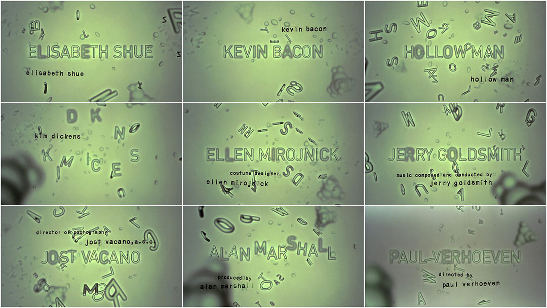 Borrowing from the distinctive look of microscopy and photomicrography, the Hollow Man titles rely on a simple premise and clean execution to convey their message. The full sequence takes place in a petri dish of sorts, with the title cards arranging themselves from an alphabet soup of microbe-like letters swimming amid other microscopic elements.
