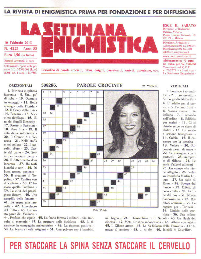 Examples of crossword and puzzle magazines, including La Settimana Enigmistica. Its cover has remained fairly consistent since 1943, included here.