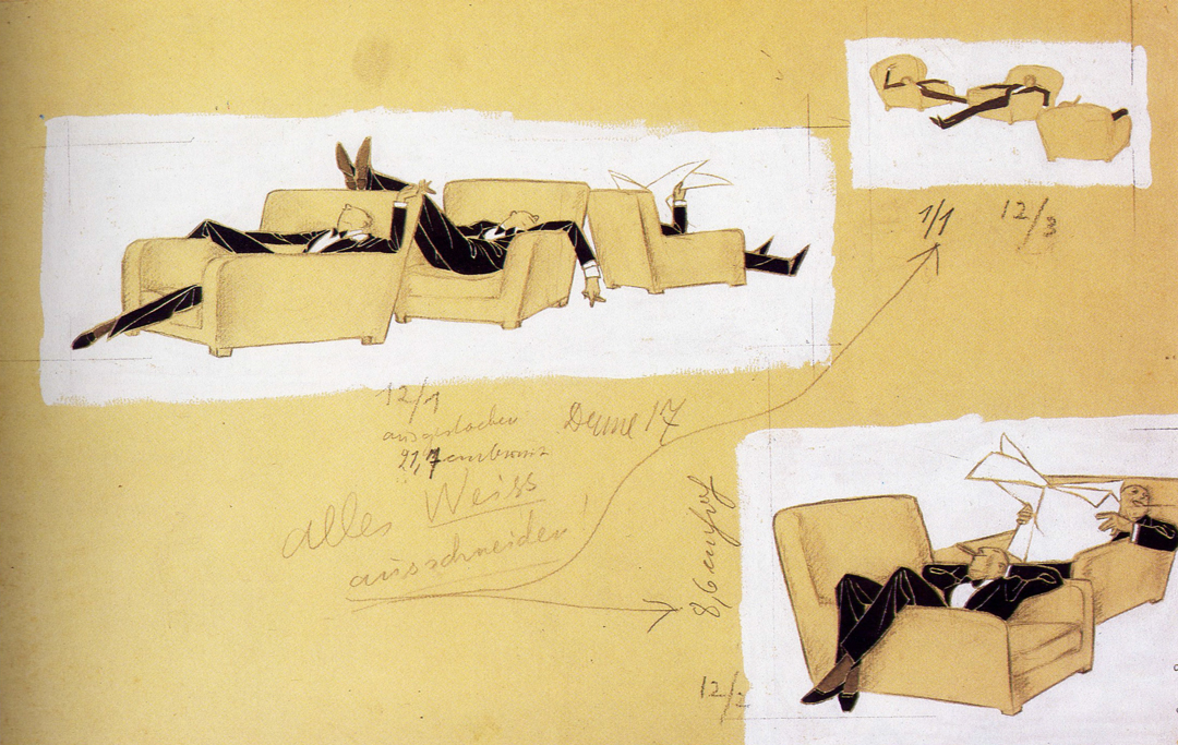 Illustration by Ernst Dryden (AKA Ernst Deutsch-Dryden) created for an article in Die Dame in gouache, ink and pencil on paper, showing istructions to the printer, circa 1928.