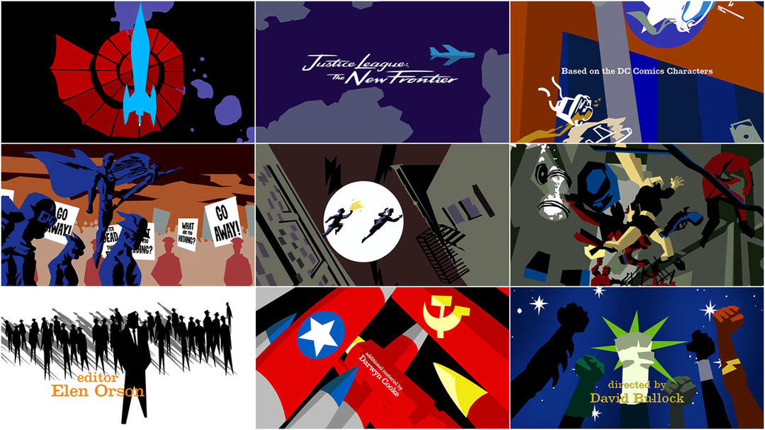 Nautilus rockets, McCarthyism in an Atomic Age, moonlit-framed rooftop chases, lightning bolts that echo Saul Bass, and a symphonic score by Kevin Manthei punctuate director and title designer David Bullock's opening to Justice League: The New Frontier.