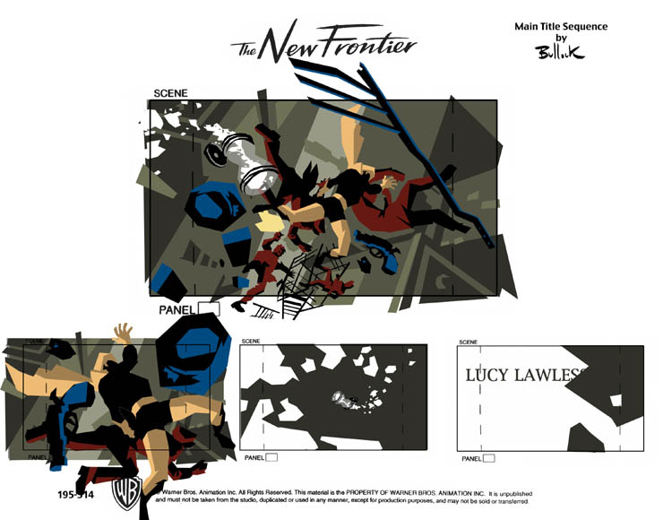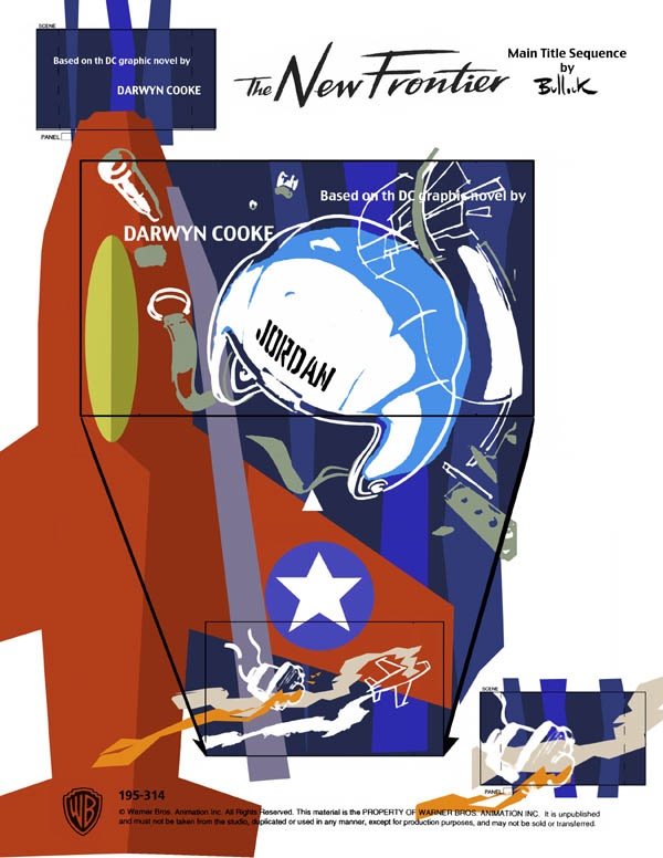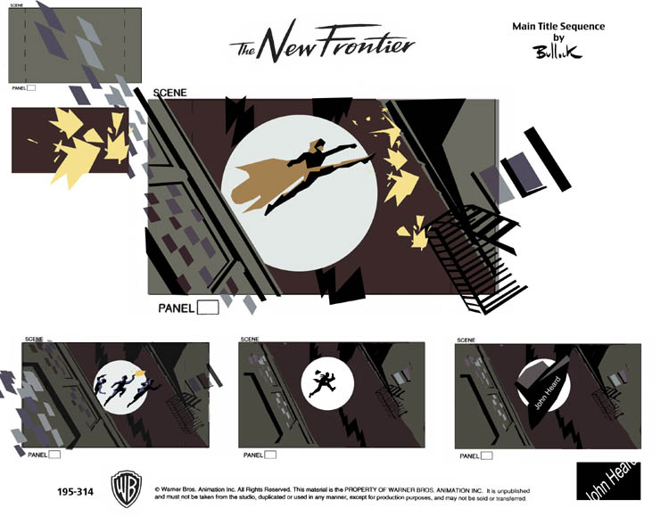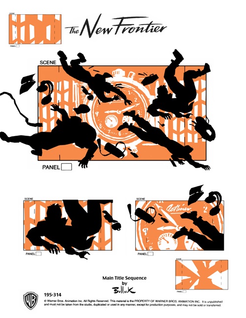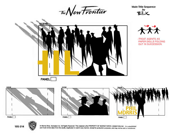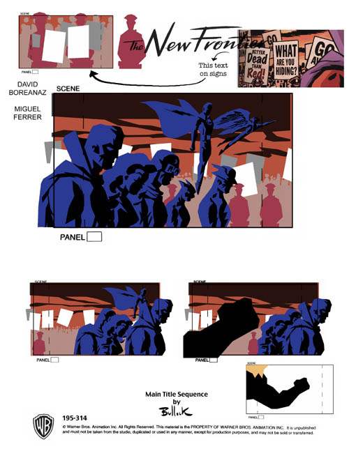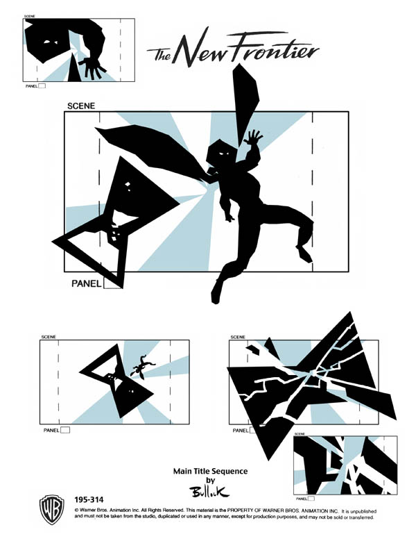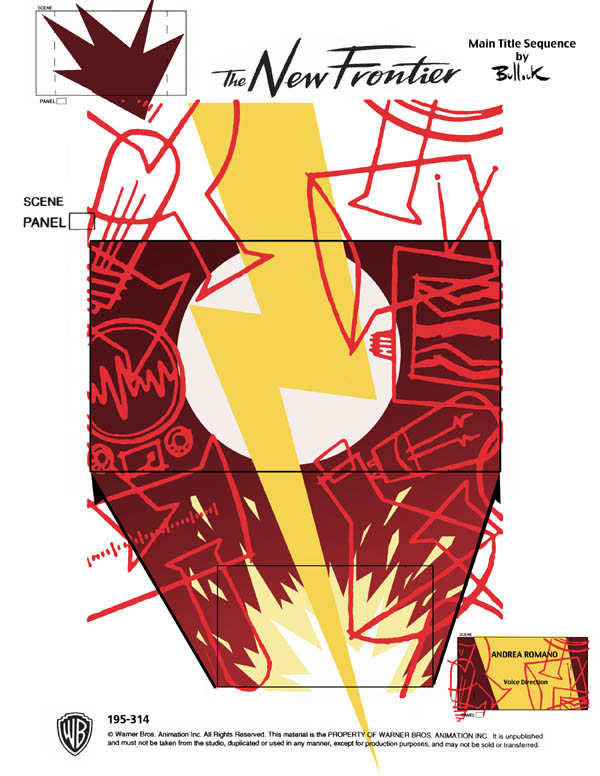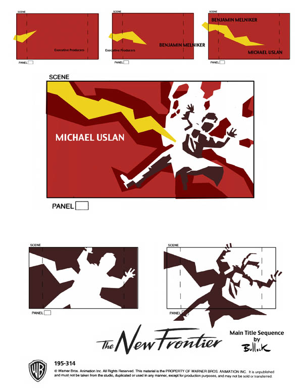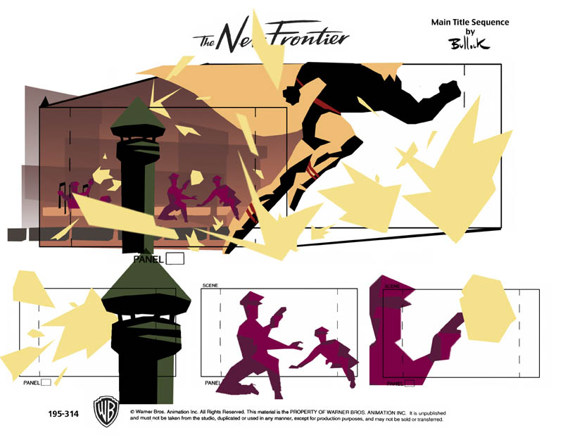 DB: I put these together with a great compositor by the name of Aziria Owens. Azi would, in After Effects I believe, build the shots from layered storyboard files that I "cut" in Photoshop. Once the individual shots were finished they went to WB's editing department. Some of the Avid work is a bit clunky, but this thing had no budget! Going for a Saul Bass approach was not only the right design approach, it was economical as well. Although we had no real money I agreed to put the titles together on weekends over the course of two to three months while I directed Sony's The Spectacular Spider-Man toon.