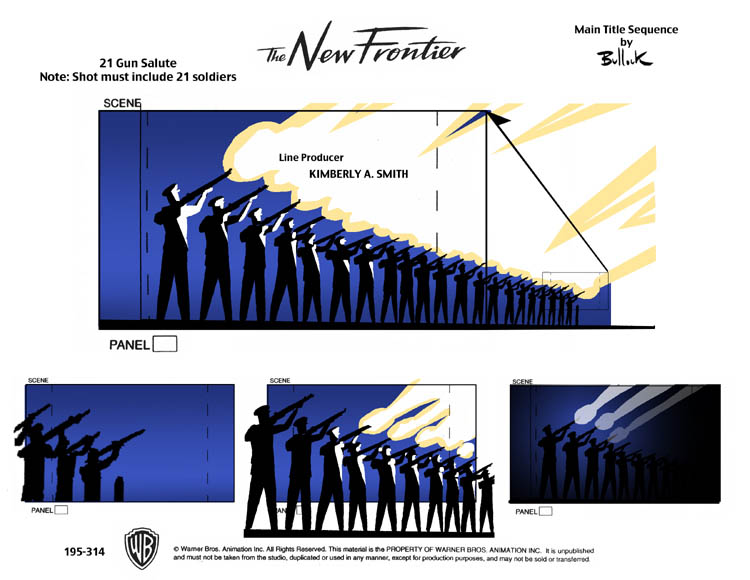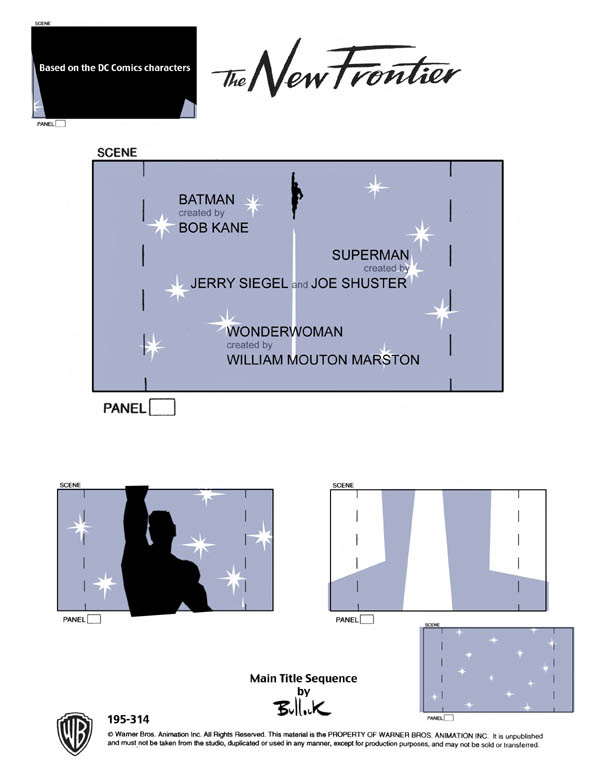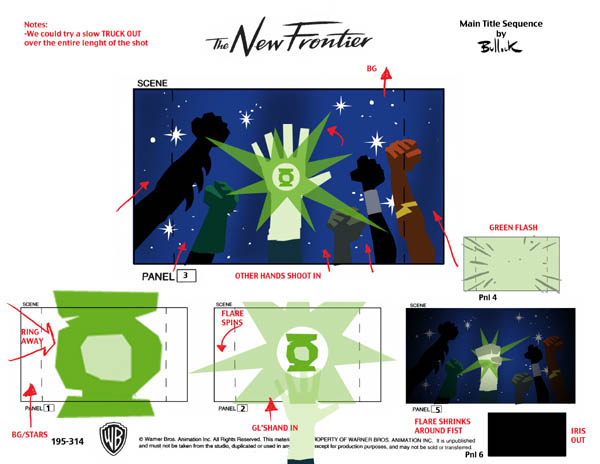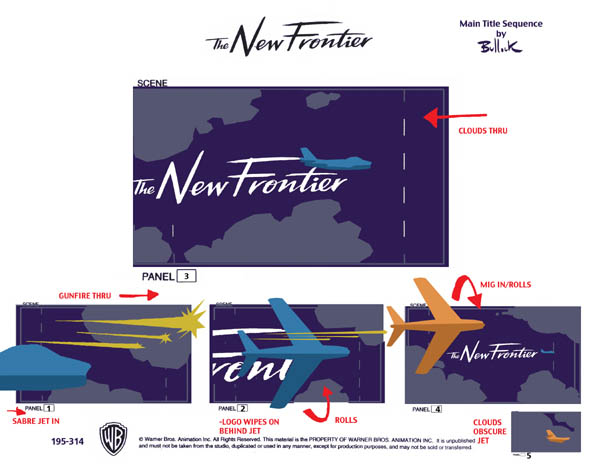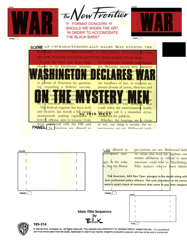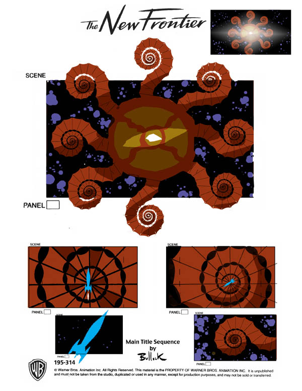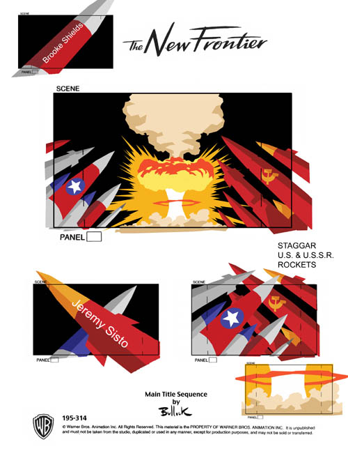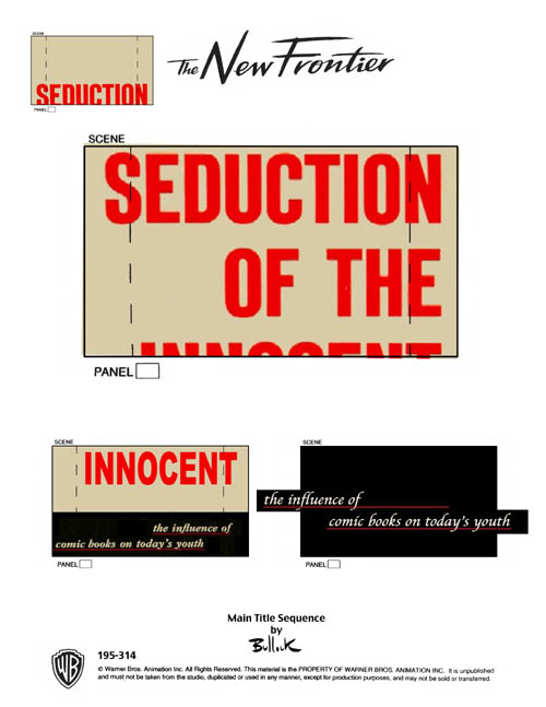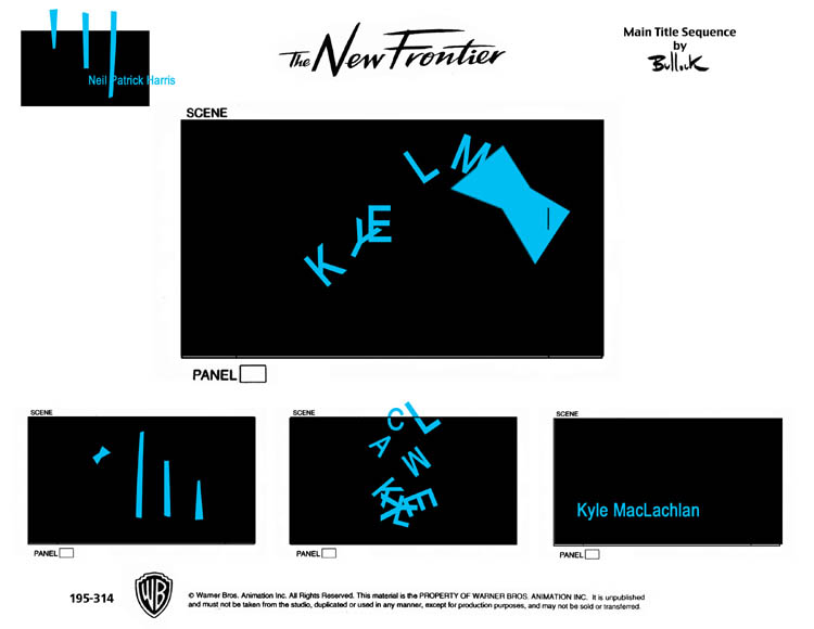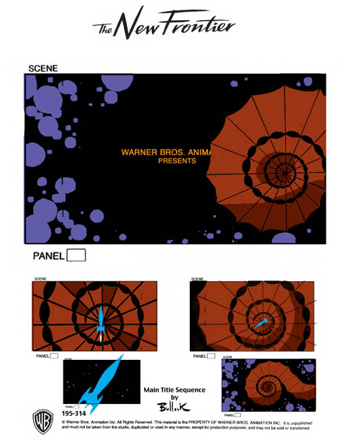 DB: I put these together with a great compositor by the name of Aziria Owens. Azi would, in After Effects I believe, build the shots from layered storyboard files that I "cut" in Photoshop. Once the individual shots were finished they went to WB's editing department. Some of the Avid work is a bit clunky, but this thing had no budget! Going for a Saul Bass approach was not only the right design approach, it was economical as well. Although we had no real money I agreed to put the titles together on weekends over the course of two to three months while I directed Sony's The Spectacular Spider-Man toon.