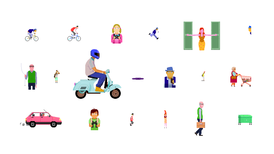 MP: Basically, pixel characters and props "living" within photographed backgrounds, with some sort of Lomography effect on the background. We later improved on this because Albert wanted something more elaborate and artistically controlled for the background colours instead of a straight photograph but the idea was already there. The goal was to to do something playful and nostalgic.