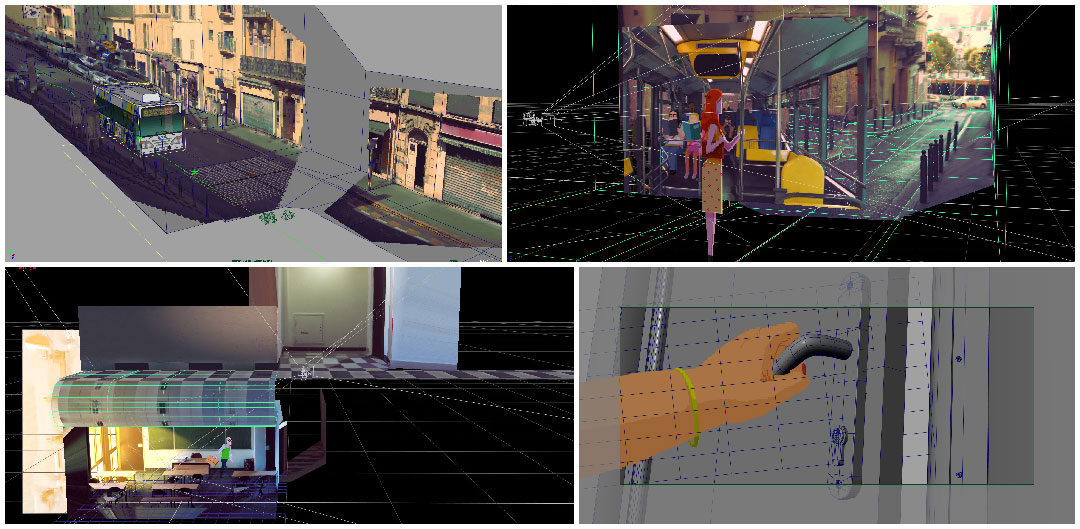 AB: I first did an animatic. I was working on it in parallel with the movie storyboard. Then I did some visual research and we chose the idea of a pixel-meets-photo aesthetic. After creating the animatic, I knew what the project needed technically, and I knew that I wasn’t able to do it alone. When Albert told me that Mitch would direct the sequence with me it was a big relief because I knew what he was capable of!