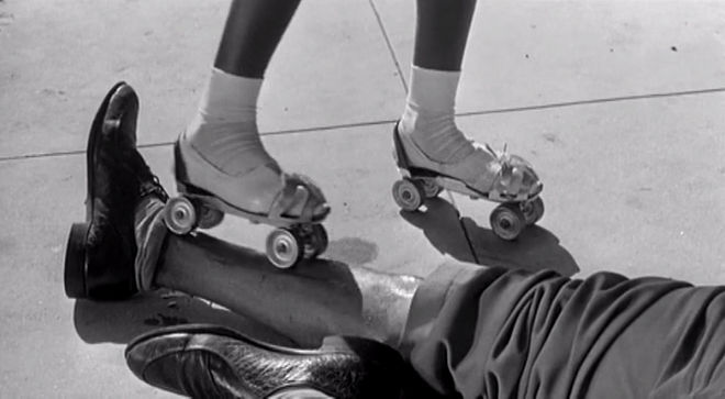 The sequence features a number of shots meant to disturb: a girl rolling her skate up and down a prostrate man’s leg, a dog lying dead in the street as drivers cruise past.