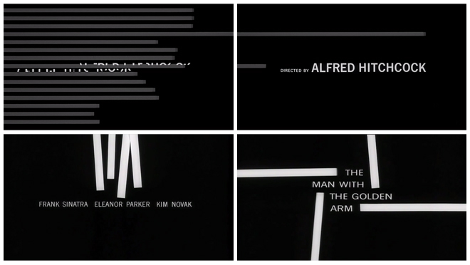 Image Set: Stills from the opening titles of Alfred Hitchcock's Psycho (1960) (top) and Otto Preminger's The Man With the Golden Arm (1955) (bottom), both designed by Saul Bass