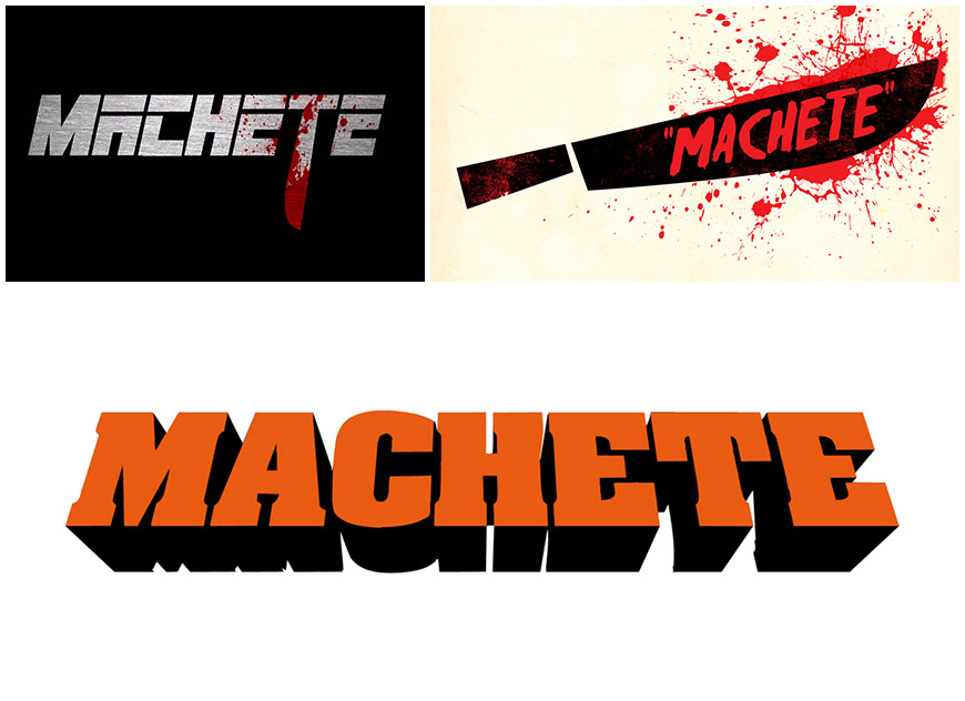 For Grindhouse, the Machete trailer was our test shoot. After the first day of production, Robert gave me some digital stills and asked that I make a set of lobby cards and work up a logo treatment. Lobby cards are basically an outdated form of movie marketing where distributors would print stills onto cardstock and display them in the lobbies of movie theaters. Lobby cards would act as a sort of printed trailer – the key images would tell you what you needed to know about the story and show you just enough sex and violence to get you into the theater. So I worked up a set of 13 lobby cards and went to work on a title treatment.