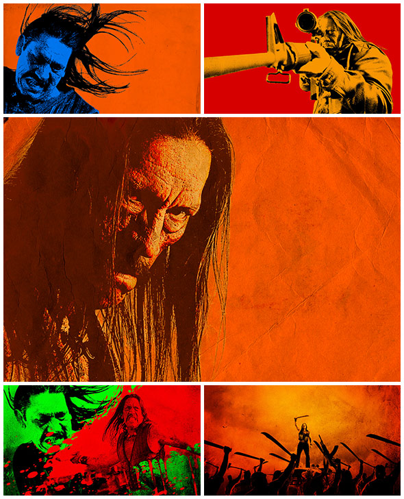 Flash forward five years. We were now in production on the feature version of Machete. Robert had a piece of music that he'd chosen for the title sequence, but beyond that he just asked that I make something “explosive.” By this point in production, I'd made a new set of lobby cards that incorporated unit stills from the feature as well as six character posters that used the gallery/poster stills taken by photographer Rico Torres and myself.