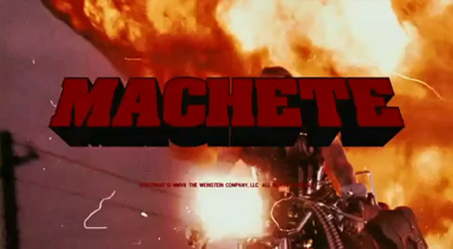Machete’s title sequence is a colorful parade of sneering villains, vixens, and an arsenal of menacing guns and knives. While the sequence sets the stage for a gory, over-the-top revenge romp, it also succeeds in grounding the entire film in another time and place. As the grainy titles scrape along at 1½ feet per second, the audience is transported back from their reclined seats at present day cineplexes to the nostalgic era of drive-ins and drafthouses.