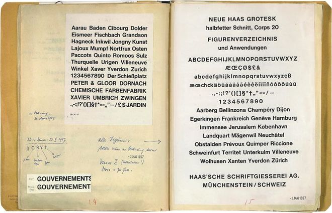 Pages from the notebook of Eduard Hoffmann, president of the Haas typefoundry in Switzerland, featuring notes on the development of Neue Haas Grotesk and Helvetica, 1957. Learn about Neue Haas Grotesk at Fontbureau.