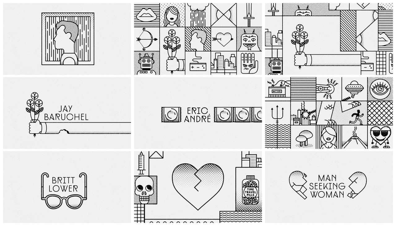 To convey that sense of romantic and manic whiplash, Digital Kitchen assembled the FXX show’s title sequence with a series of snappy black-and-white animations. Hurtling forward through an ever changing three-by-five grid, we get tidy little doodles of trolls, trains, and tridents; frowning condoms, wilting flowers, cassettes, skulls, and ray guns. How best to put it? It’s a giddy bit of nonsense that hints at Man Seeking Woman’s disparate, breakneck comedy. It’s like the atomic, twitchy love-child of Keith Haring and Tex Avery; a stream-of-consciousness cartoon, complete with sight gags, a punchy trip-hop theme, and cool, clean illustrations.