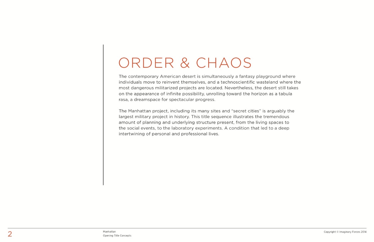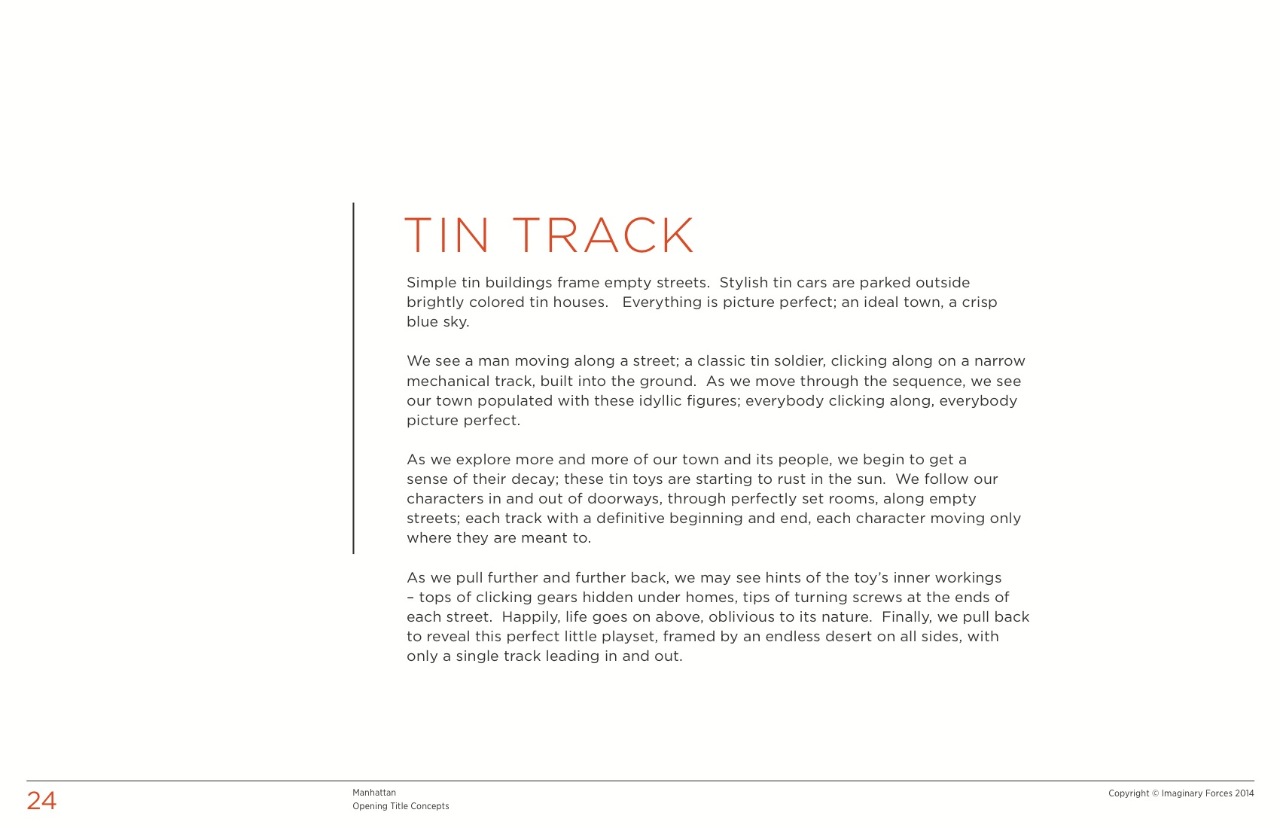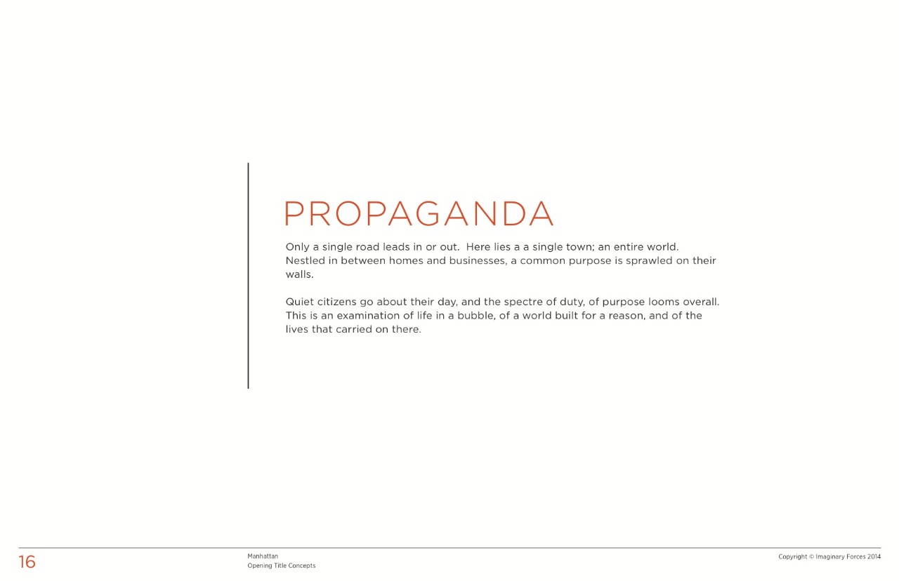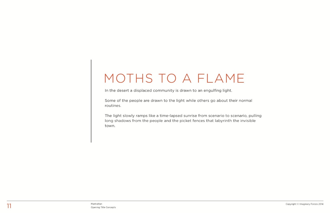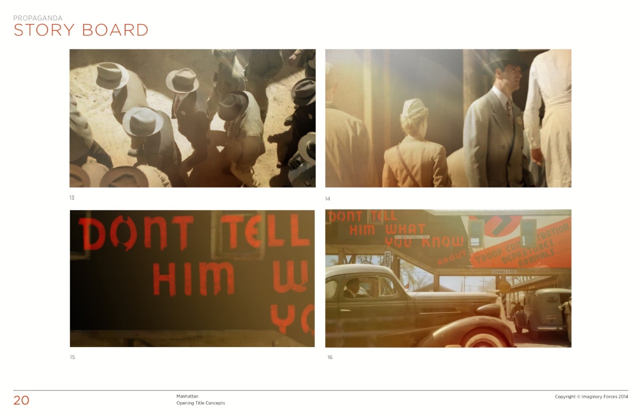 Dan: Sam Shaw [Manhattan's creator] and Peter Frankfurt [Imaginary Forces co-founder and executive creative director] go back a ways, but for whatever reason we hadn’t been able to line up on a project before this came in.