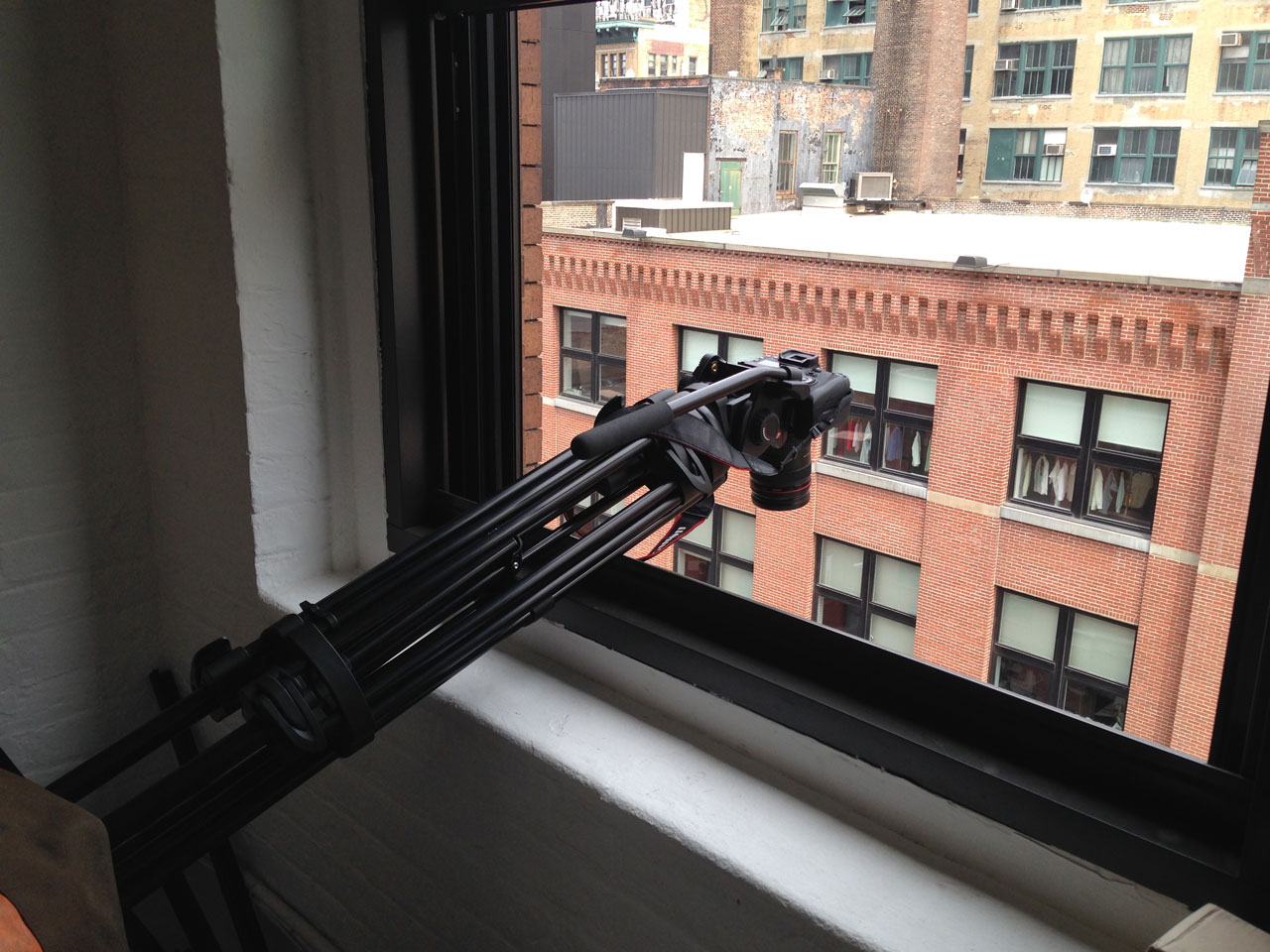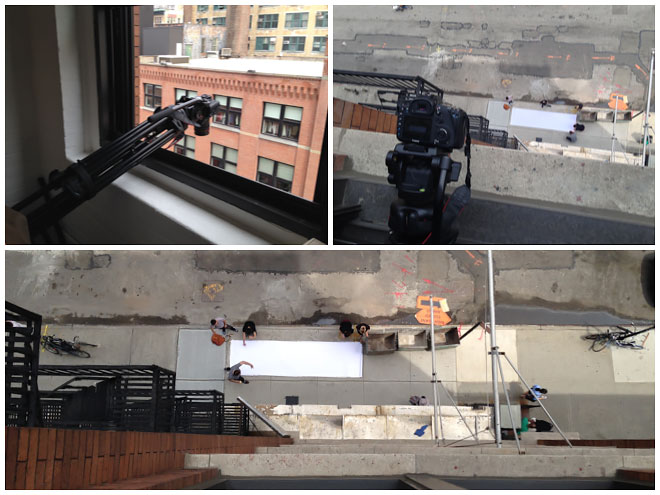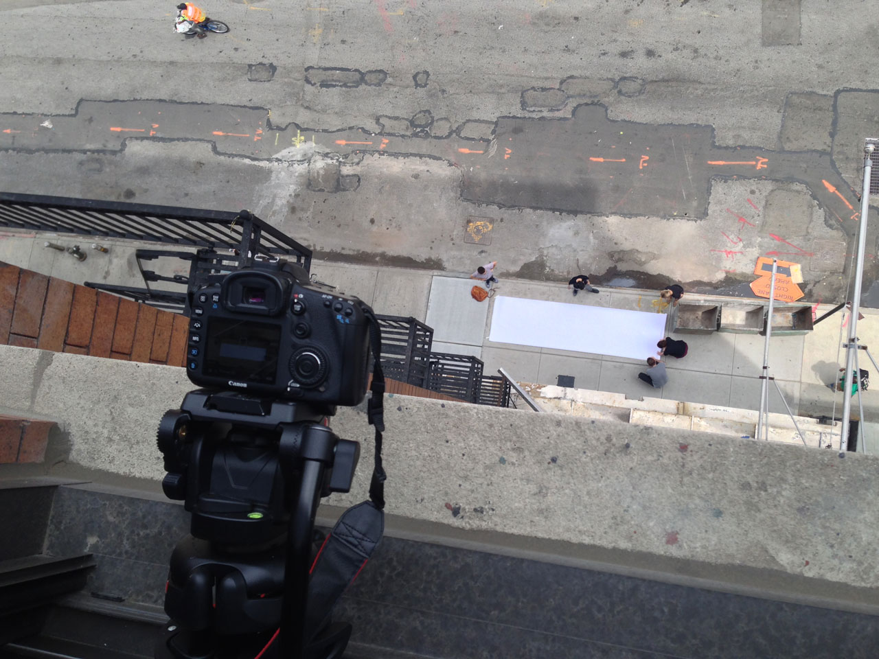 Dan: That was actually a ton of fun! I was on the ground and we layed down a 4x16 piece of white paper for people to walk on so it would be easier for roto. I had Jeremy on speaker while I was directing people. He was five flights up, hanging out the window with the 7D.