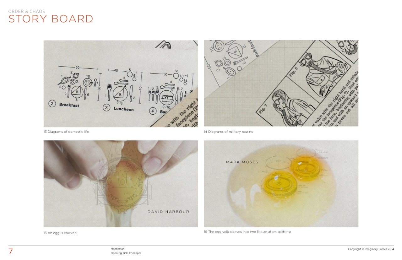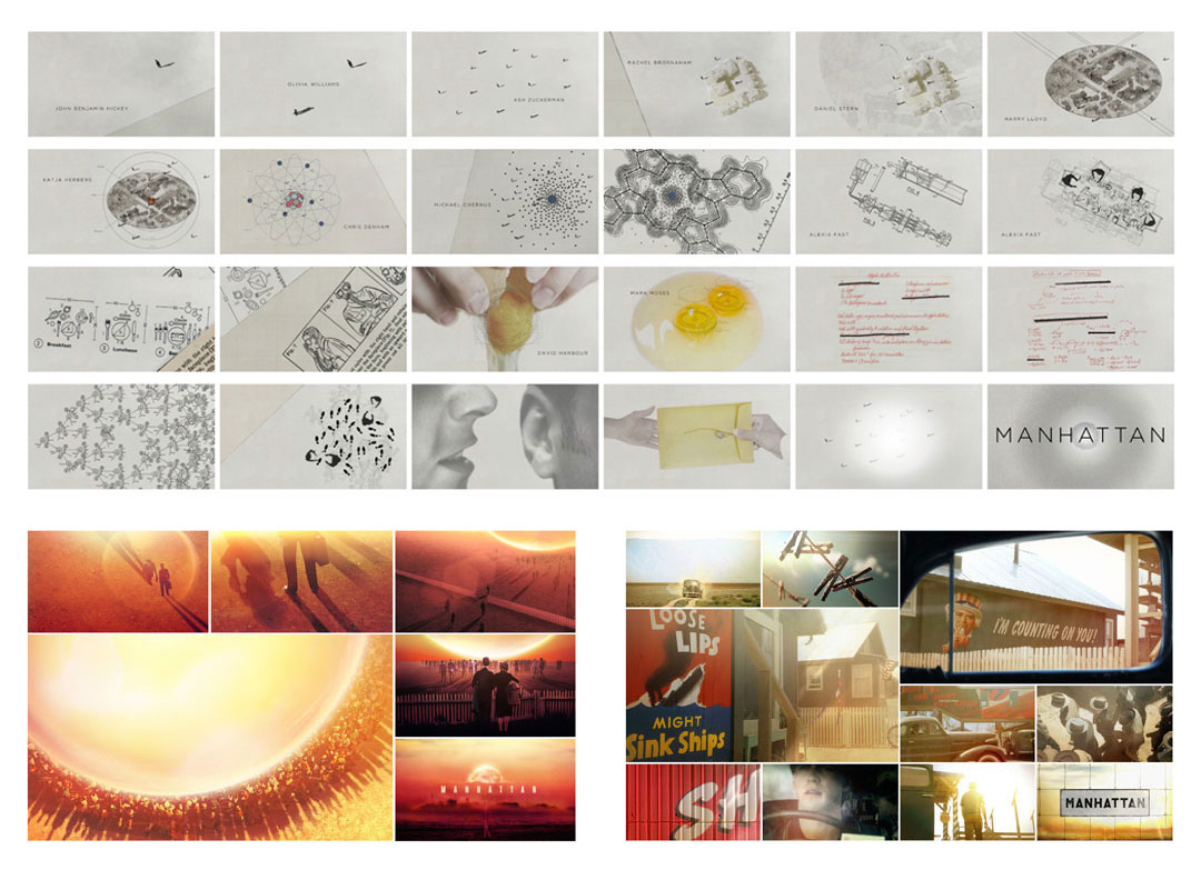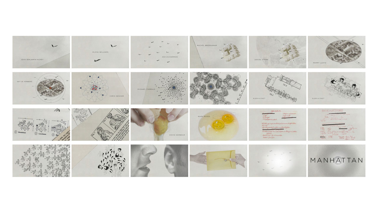 With oblique references to other famous intros, the Manhattan opening stands firmly amidst the framework of the history of title design. The tiny figures and long shadows evoke the opening of The Conversation, the parting hands eerily similar to those in Six Feet Under, the redacted information reminiscent of Karin Fong’s work for Rubicon, and even the egg, a possible nod to Dexter.