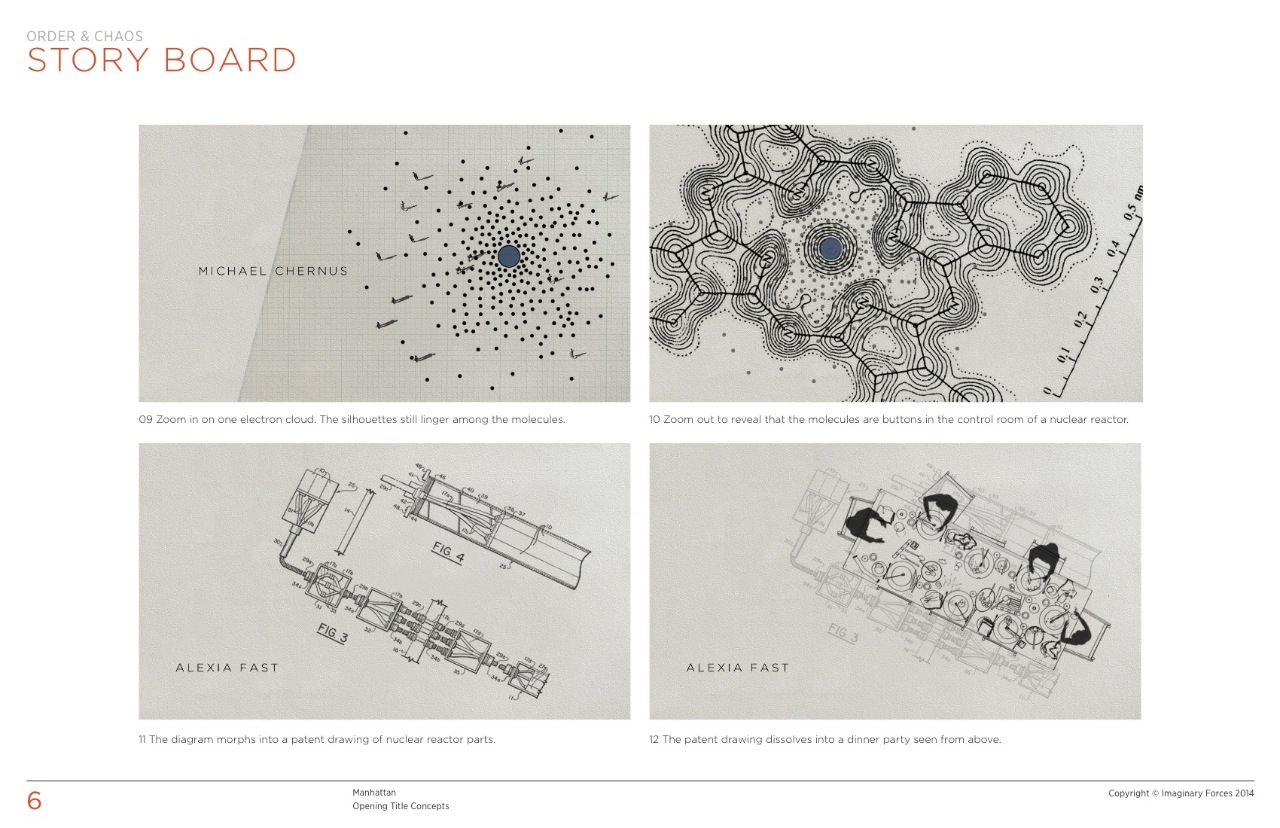 Dan: We used two key scenes as the basis of our motion tests: the dance sequence and the reactor/table schematic. Once we illustrated how the sliding and falling pages of plans would be used as a formula for a transitional device we were set, and Sam and Tom Schlamme [Director/Executive Producer] were comfortable. From there, we were all on the same page and we flowed through the rest of the piece without a lot of back and forth.